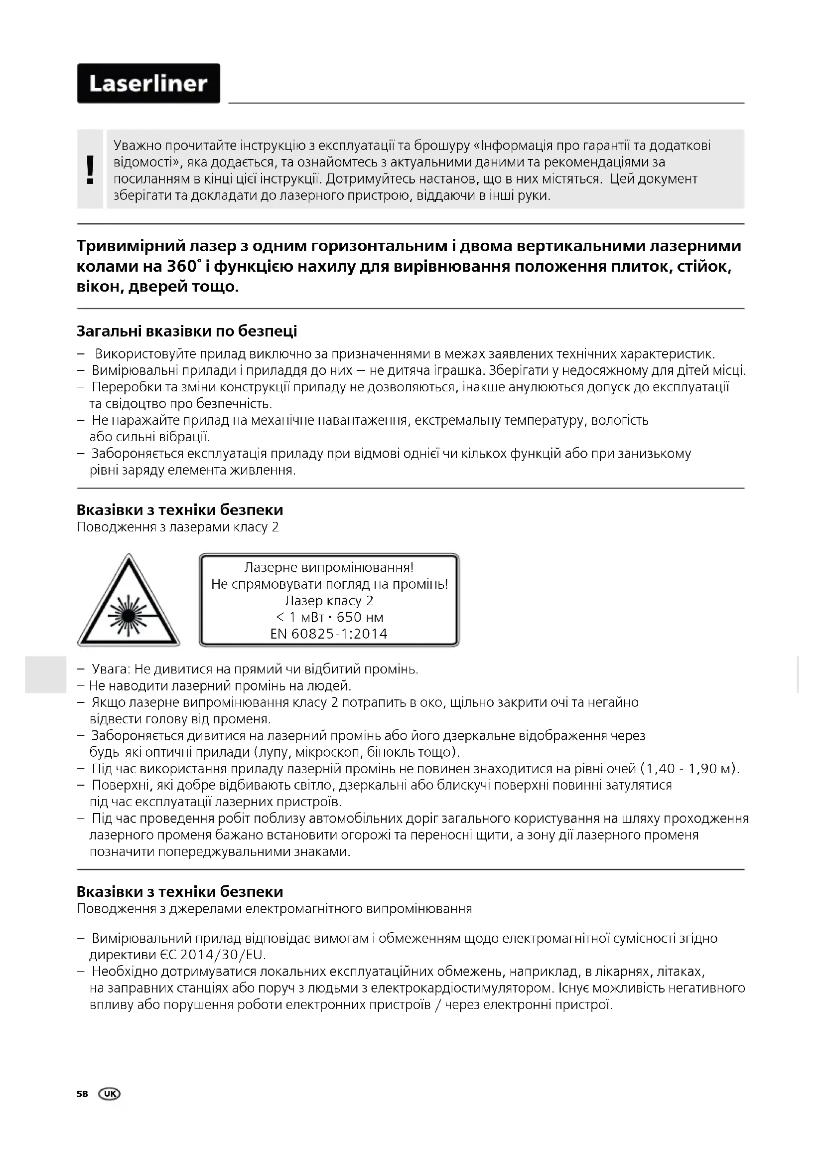 RU58 – Вимірювальний прилад відповідає вимогам і обмеженням щодо електромагнітної сумісності згідно директиви ЄС 2014/30/EU. – Необхідно дотримуватися локальних експлуатаційних обмежень, наприклад, в лікарнях, літаках, на заправних станціях або поруч з людьми з електрокардіостимулятором. Існує можливість негативного впливу або порушення роботи електронних пристроїв / через електронні пристрої. Вказівки з техніки безпеки Поводження з джерелами електромагнітного випромінювання – Увага: Не дивитися на прямий чи відбитий промінь. – Не наводити лазерний промінь на людей. – Якщо лазерне випромінювання класу 2 потрапить в око, щільно закрити очі та негайно відвести голову від променя. – Забороняється дивитися на лазерний промінь або його дзеркальне відображення через будь-які оптичні прилади (лупу, мікроскоп, бінокль тощо). – Під час використання приладу лазерній промінь не повинен знаходитися на рівні очей (1,40 - 1,90 м). – Поверхні, які добре відбивають світло, дзеркальні або блискучі поверхні повинні затулятися під час експлуатації лазерних пристроїв. – Під час проведення робіт поблизу автомобільних доріг загального користування на шляху проходження лазерного променя бажано встановити огорожі та переносні щити, а зону дії лазерного променя позначити попереджувальними знаками. Вказівки з техніки безпеки Поводження з лазерами класу 2 Загальні вказівки по безпеці – Використовуйте прилад виключно за призначеннями в межах заявлених технічних характеристик. – Вимірювальні прилади і приладдя до них — не дитяча іграшка. Зберігати у недосяжному для дітей місці. – Переробки та зміни конструкції приладу не дозволяються, інакше анулюються допуск до експлуатації та свідоцтво про безпечність. – Не наражайте прилад на механічне навантаження, екстремальну температуру, вологість або сильні вібрації. – Забороняється експлуатація приладу при відмові однієї чи кількох функцій або при занизькому рівні заряду елемента живлення. Тривимірний лазер з одним горизонтальним і двома вертикальними лазерними колами на 360° і функцією нахилу для вирівнювання положення плиток, стійок, вікон, дверей тощо. Уважно прочитайте інструкцію з експлуатації та брошуру «Інформація про гарантії та додаткові відомості», яка додається, та ознайомтесь з актуальними даними та рекомендаціями за посиланням в кінці цієї інструкції. Дотримуйтесь настанов, що в них містяться. Цей документ зберігати та докладати до лазерного пристрою, віддаючи в інші руки.