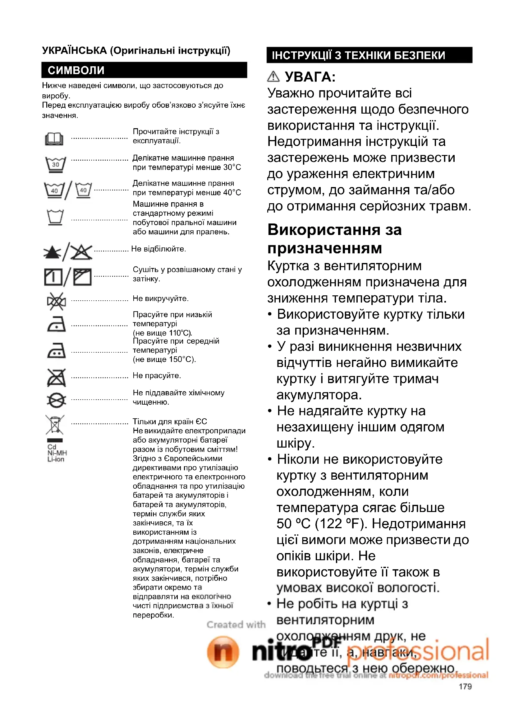 - Використовуйте куртку лише зі спеціально призначеним типом акумуляторів. Використання акумуляторів інших типів може призвести до отримання травм і виникнення пожежі.
