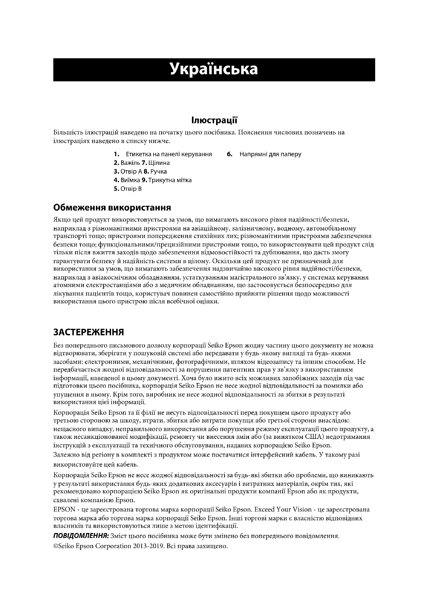 Більшість ілюстрацій наведено на початку цього посібника. Пояснення числових позначень на ілюстраціях наведено в списку нижче. Обмеження використання Якщо цей продукт використовується за умов, що вимагають високого рівня надійності/безпеки, наприклад з різноманітними пристроями на авіаційному, залізничному, водному, автомобільному транспорті тощо; пристроями попередження стихійних лих; різноманітними пристроями забезпечення безпеки тощо; функціональними/прецизійними пристроями тощо, то використовувати цей продукт слід тільки після вжиття заходів щодо забезпечення відмовостійкості та дублювання, що дасть змогу гарантувати безпеку й надійність системи в цілому. Оскільки цей продукт не призначений для використання за умов, що вимагають забезпечення надзвичайно високого рівня надійності/безпеки, наприклад з авіакосмічним обладнанням, устаткуванням магістрального зв’язку, у системах керування атомними електростанціями або з медичним обладнанням, що застосовується безпосередньо для лікування пацієнтів тощо, користувач повинен самостійно прийняти рішення щодо можливості використання цього пристрою після всебічної оцінки. ЗАСТЕРЕЖЕННЯ Без попереднього письмового дозволу корпорації Seiko Epson жодну частину цього документу не можна відтворювати, зберігати у пошуковій системі або передавати у будь-якому вигляді та будь-якими засобами: електронними, механічними, фотографічними, шляхом відеозапису та іншим способом. Не передбачається жодної відповідальності за порушення патентних прав у зв’язку з використанням інформації, наведеної в цьому документі. Хоча було вжито всіх можливих запобіжних заходів під час підготовки цього посібника, корпорація Seiko Epson не несе жодної відповідальності за помилки або упущення в ньому. Крім того, виробник не несе жодної відповідальності за збитки в результаті використання цієї інформації. Корпорація Seiko Epson та її філії не несуть відповідальності перед покупцем цього продукту або третьою стороною за шкоду, втрати, збитки або витрати покупця або третьої сторони внаслідок: нещасного випадку, неправильного використання або порушення режиму експлуатації цього продукту, а також несанкціонованої модифікації, ремонту чи внесення змін або (за винятком США) недотримання інструкцій з експлуатації та технічного обслуговування, наданих корпорацією Seiko Epson. Залежно від регіону в комплекті з продуктом може постачатися інтерфейсний кабель. У такому разі використовуйте цей кабель. Корпорація Seiko Epson не несе жодної відповідальності за будь-які збитки або проблеми, що виникають у результаті використання будь-яких додаткових аксесуарів і витратних матеріалів, окрім тих, які рекомендовано корпорацією Seiko Epson як оригінальні продукти компанії Epson або як продукти, схвалені компанією Epson. EPSON - це зареєстрована торгова марка корпорації Seiko Epson. Exceed Your Vision - це зареєстрована торгова марка або торгова марка корпорації Seiko Epson. Інші торгові марки є власністю відповідних власників та використовуються лише з метою ідентифікації. ПОВІДОМЛЕННЯ: Зміст цього посібника може бути змінено без попереднього повідомлення. ©Seiko Epson Corporation 2013-2019. Всі права захищено.