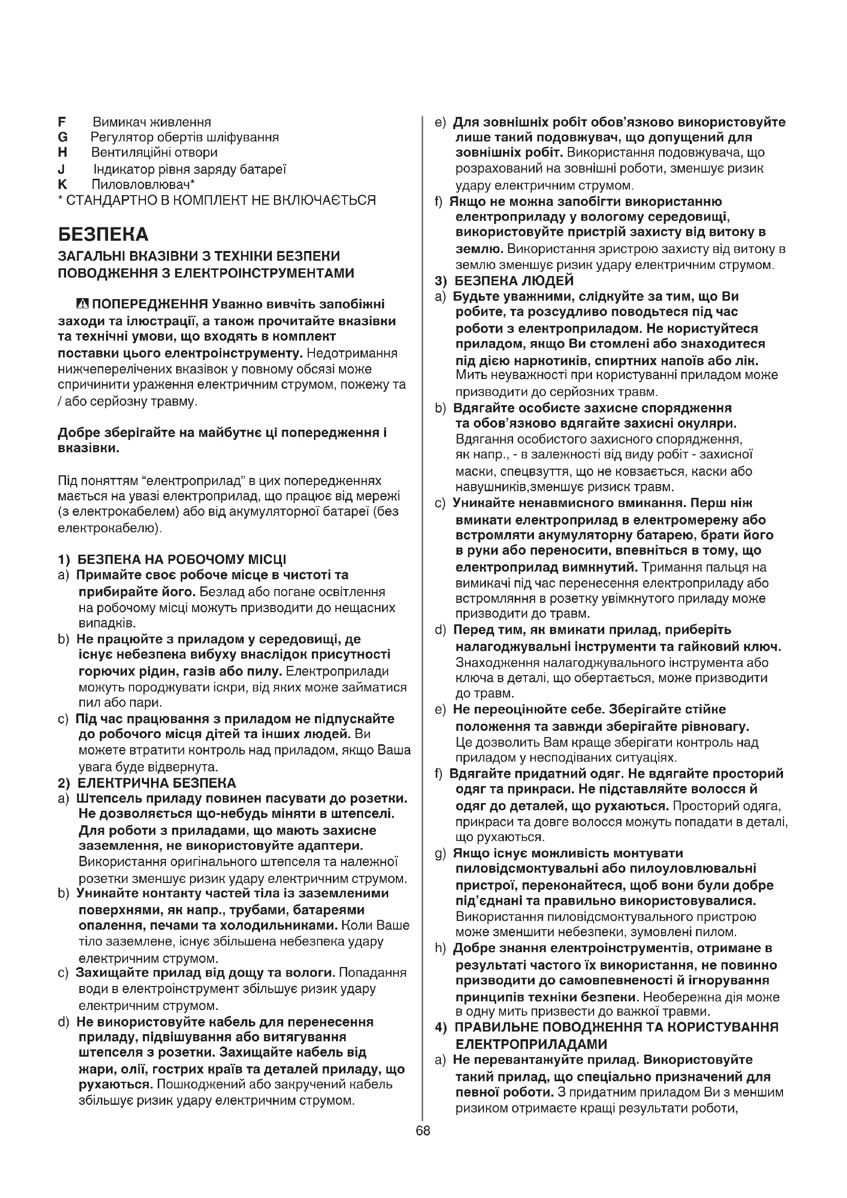ЕЛЕКТРОПРИЛАДАМИ a) Не перевантажуйте прилад. Використовуйте такий прилад, що спеціально призначений для певної роботи. З придатним приладом Ви з меншим ризиком отримаєте кращі результати роботи, F Вимикач живлення G Регулятор обертів шліфування H Вентиляційні отвори J Індикатор рівня заряду батареї K Пиловловлювач*