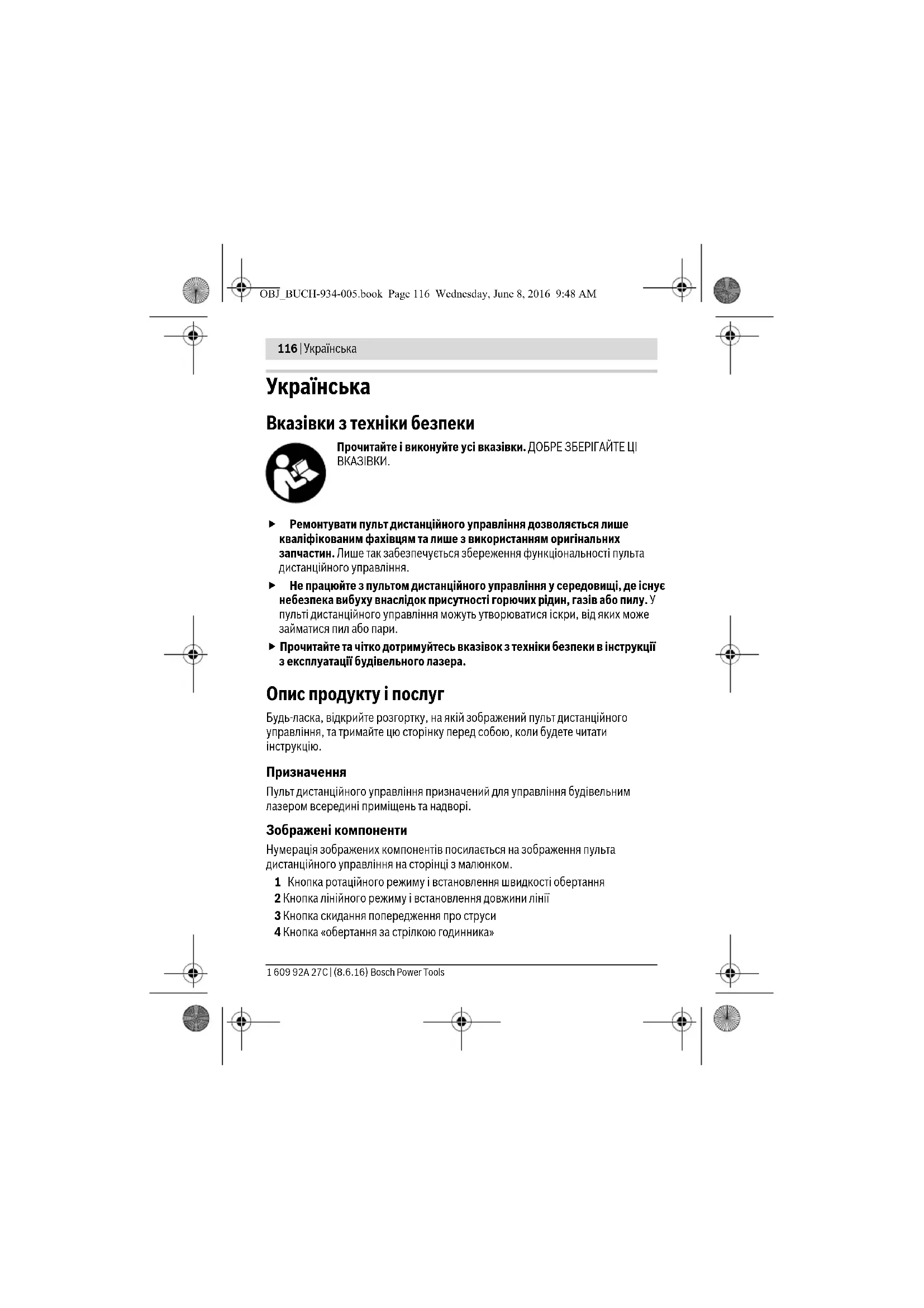 промені).Для точної ідентифікації Вашого пульта дистанційного управління на заводській табличці позначений серійний номер 10. OBJ_BUCH-934-005.book Page 117 Wednesday, June 8, 2016 9:48 AM118 | Українська 1 609 92A 27C | (8.6.16) Bosch Power Tools Експлуатація Початок роботи Захищайте пульт дистанційного управління від вологи та прямих сонячних променів. Не допускайте впливу на пульт дистанційного управління екстремальних температур або температурних перепадів. Зокрема, не залишайте його на тривалий час в машині. Якщо пульт дистанційного управління зазнав впливу перепаду температур, перш ніж вмикати його, дайте йому стабілізувати свою температуру. При встромленій батарейці з достатньою напругою пульт дистанційного управління завжди знаходиться в робочій готовності. Встановіть будівельний лазер таким чином, щоб сигнали пульта дистанційного управління попадали прямо на одну із прийомних лінз будівельного лазера (див. інструкцію з експлуатації будівельного лазера). Якщо пульт дистанційного управління не можна направити прямо на прийомну лінзу, радіус дії зменшується. Завдяки віддзеркаленню сигналу (напр., на стінах) радіус дії можна знову збільшити навіть при непрямому сигналі. Після натискання на одну з кнопок на пульті дистанційного управління загоряння індикатора режиму роботи 6 свідчить про те, що сигнал відправлений. Вимикання будівельного лазера з пульта дистанційного управління неможливе. Режими роботи Детальну інформацію стосовно функцій будівельного лазера Ви знайдете в інструкції з експлуатації будівельного лазера. Ротаційний режим (150/300/600 хвил.