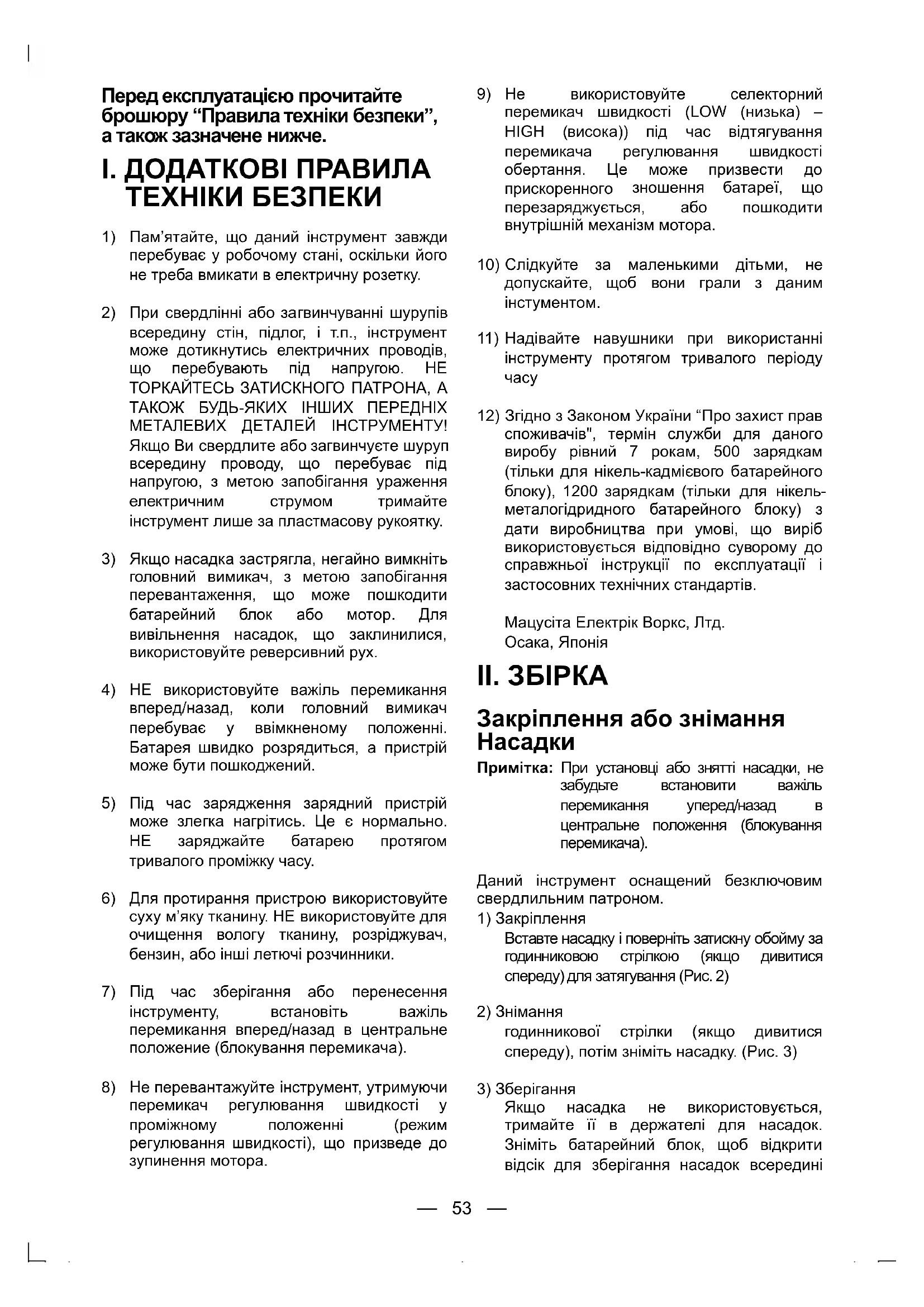 всередину стін, підлог, і т.п., інструмент може дотикнутись електричних проводів, що перебувають під напругою. НЕ ТОРКАЙТЕСЬ ЗАТИСКНОГО ПАТРОНА, А ТАКОЖ БУДЬ-ЯКИХ ІНШИХ ПЕРЕДНІХ МЕТАЛЕВИХ ДЕТАЛЕЙ ІНСТРУМЕНТУ!