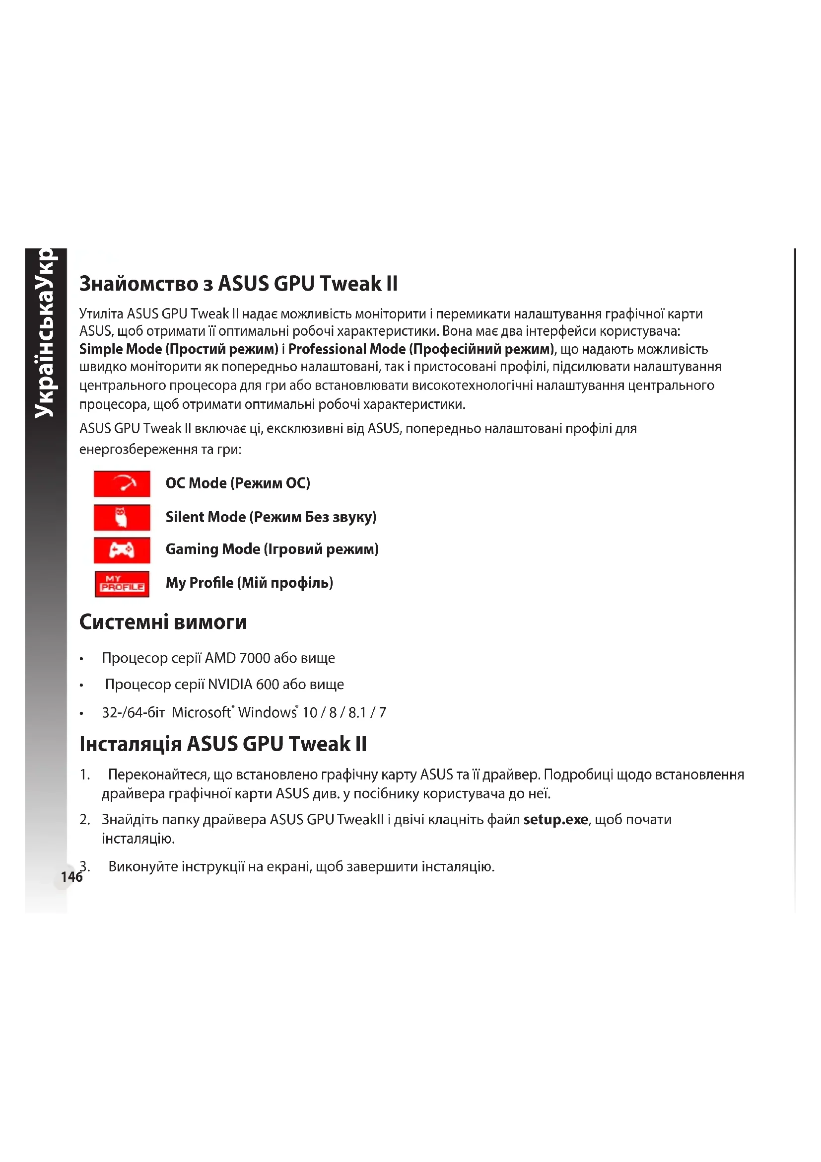- Notifymebutdonotautomaticallydownloadorinstallupdates(Informarmeperonodescargaroinstalar actualizacionesautomáticamente):seleccioneestaopciónpararecibirnoticacionessolamenteydecidirsi descargar e instalar o no las actualizaciones. Conguración de la actualización en directo145 Español Español Métodos abreviados de teclado Active o desactive los accesos métodos abreviados de teclado para mostrar rápidamente la pantalla principal o aplicar algunos ajustes rápidos. Conguración de métodos abreviados de teclado146 УкраїнськаУкраїнська Знайомство з ASUS GPU Tweak II Утиліта ASUS GPU Tweak IІ надає можливість моніторити і перемикати налаштування графічної карти ASUS, щоб отримати її оптимальні робочі характеристики. Вона має два інтерфейси користувача: Simple Mode (Простий режим) і Professional Mode (Професійний режим), що надають можливість швидко моніторити як попередньо налаштовані, так і пристосовані профілі, підсилювати налаштування центрального процесора для гри або встановлювати високотехнологічні налаштування центрального процесора, щоб отримати оптимальні робочі характеристики. ASUS GPU Tweak II включає ці, ексклюзивні від ASUS, попередньо налаштовані профілі для енергозбереження та гри: OC Mode (Режим ОС) Silent Mode (Режим Без звуку) Gaming Mode (Ігровий режим) My Prole (Мій профіль) Системні вимоги