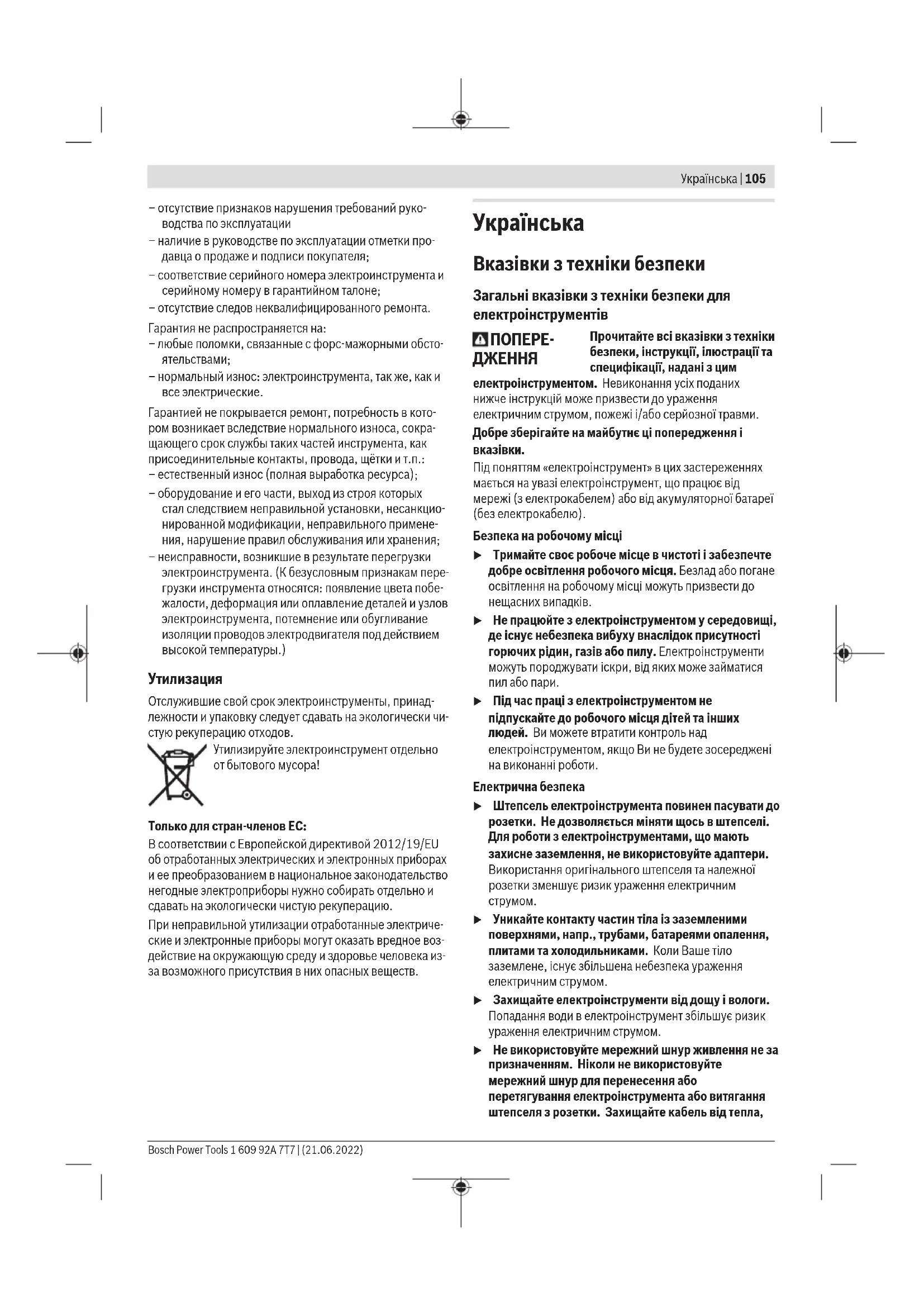 u Тримайте рукоятки і поверхні захвату сухими і чистими, слідкуйте, щоб на них не було оливи або густого мастила. Слизькі рукоятки і поверхні захвату унеможливлюють безпечне поводження з електроінструментом та його контролювання в неочікуваних ситуаціях. 1 609 92A 7T7 | (21.06.2022) Bosch Power ToolsУкраїнська | 107