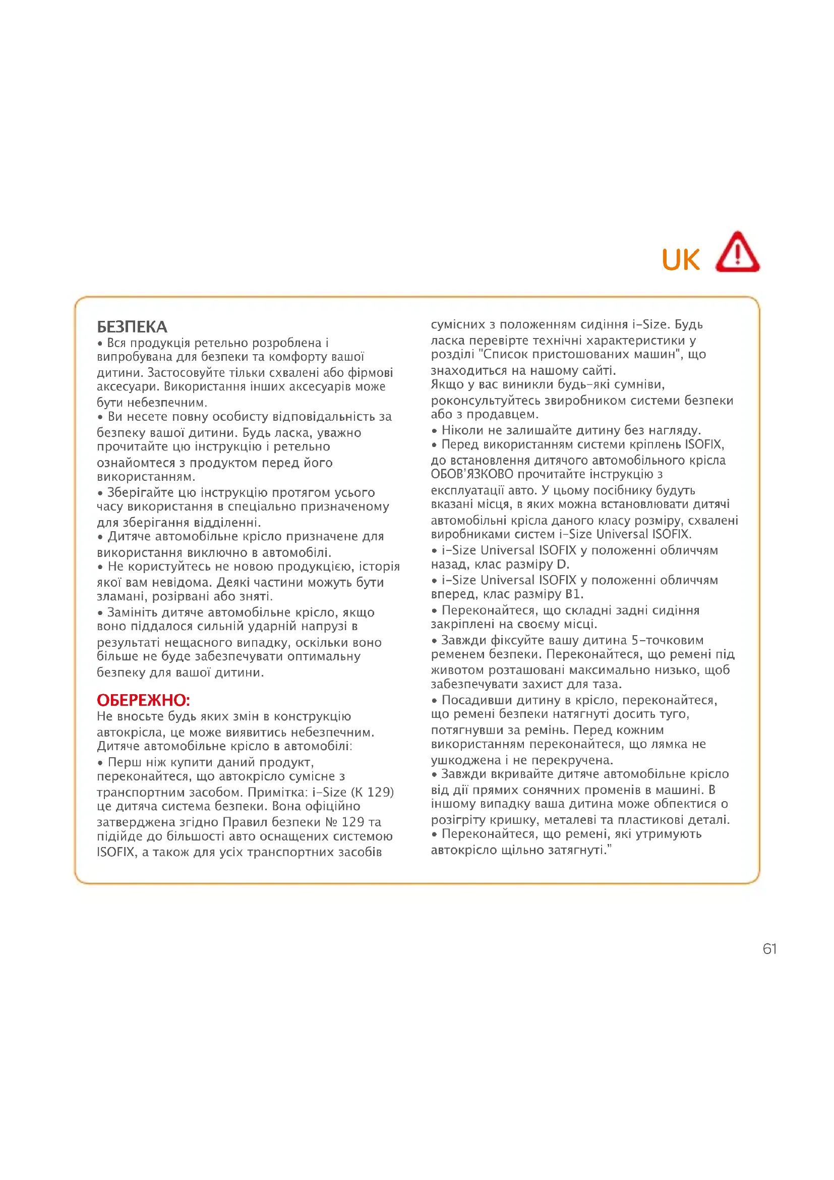 - Перш ніж купити даний продукт, переконайтеся, що автокрісло сумісне з транспортним засобом. Примітка: i-Size (К 129) це дитяча система безпеки. Вона офіційно затверджена згідно Правил безпеки № 129 та підійде до більшості авто оснащених системою ISOFIX, а також для усіх транспортних засобів сумісних з положенням сидіння i-Size. Будь ласка перевірте технічні характеристики у розділі "Список пристошованих машин", що знаходиться на нашому сайті. Якщо у вас виникли будь-які сумніви, роконсультуйтесь звиробником системи безпеки або з продавцем.