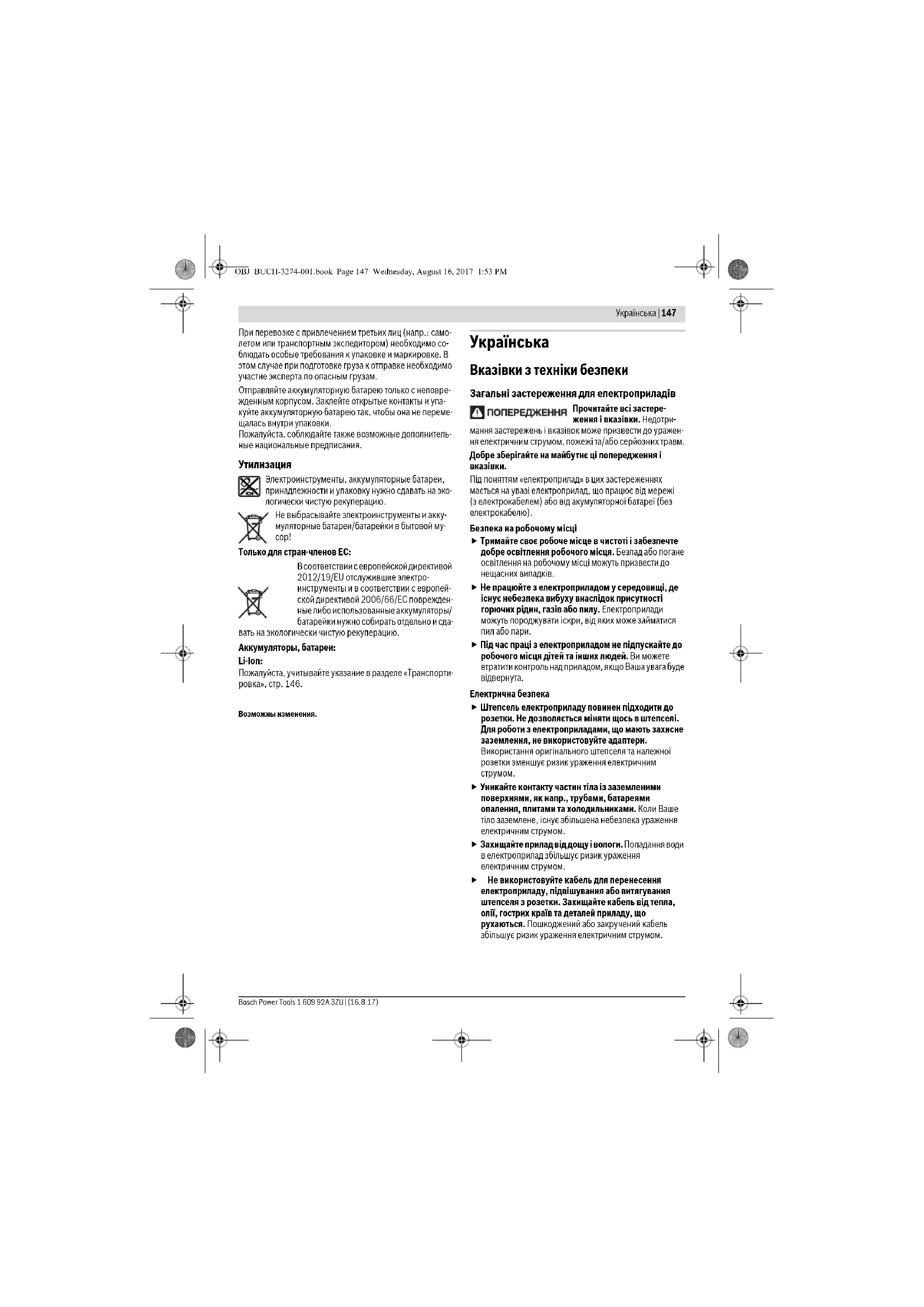 OBJ_BUCH-3274-001.book Page 148 Wednesday, August 16, 2017 1:53 PMУкраїнська | 149 Bosch Power Tools 1 609 92A 3ZU | (16.8.17) Не зберігайте акумуляторну батарею, якою Ви саме не користуєтесь, поряд із канцелярськими скріпками, ключами, гвіздками, гвинтами та іншими невеликими металевими предметами, які можуть спричинити перемикання контактів. Коротке замикання між контактами акумуляторної батареї може спричиняти опіки або пожежу. При неправильному використанні з акумуляторної батареї може потекти рідина. Уникайте контакту з нею. При випадковому контакті промийте відпо- відне місце водою. Якщо рідина потрапила в очі, додатково зверніться до лікаря. Акумуляторна рідина може спричиняти подразнення шкіри або опіки.