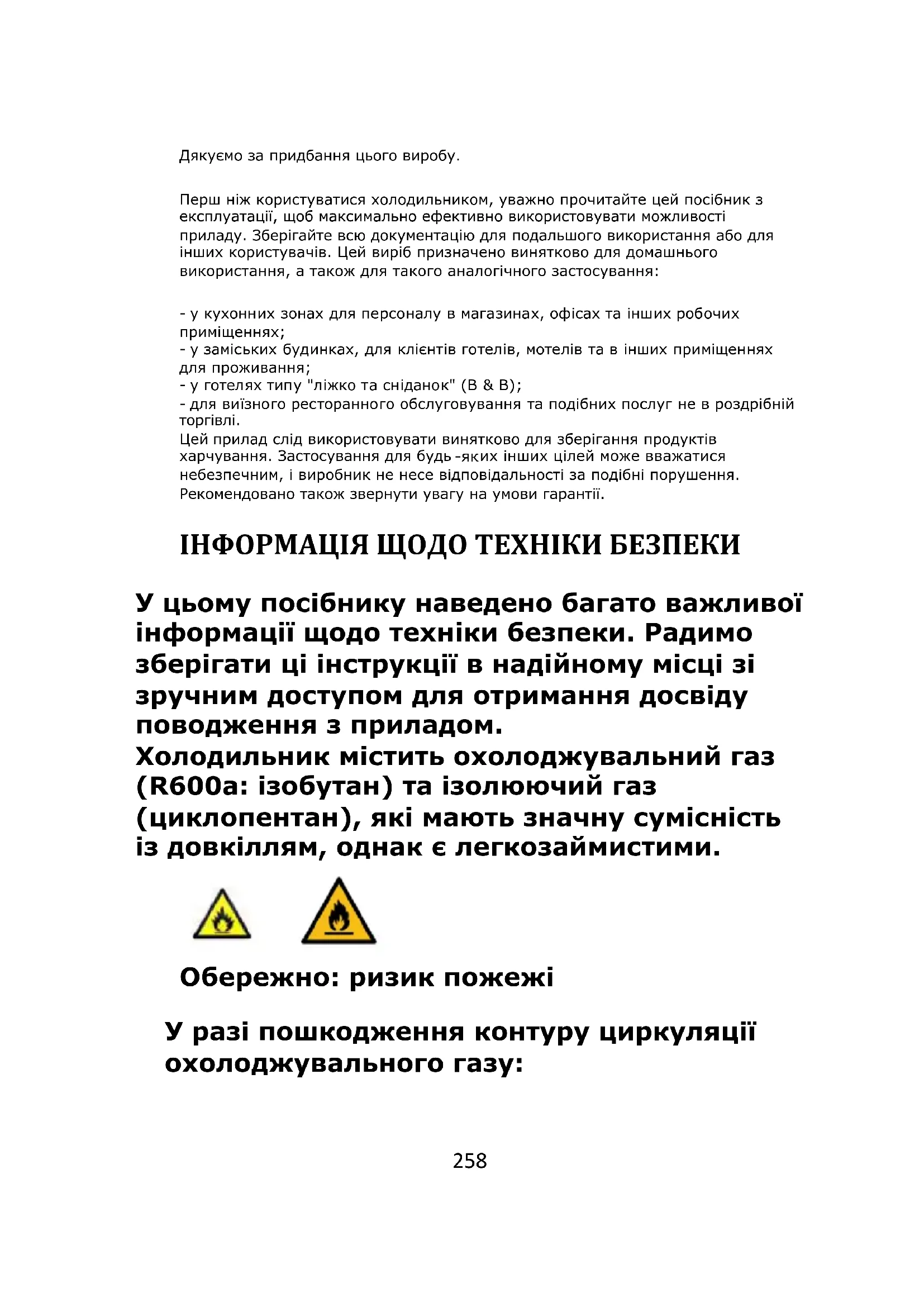 их інших цілей може вважатися небезпечним, і виробник не несе відповідальності за подібні порушення. Рекомендовано також звернути увагу на умови гарантії. ІНФОРМАЦІЯ ЩОДО ТЕХНІКИ БЕЗПЕКИ У цьому посібнику наведено багато важливої інформації щодо техніки безпеки. Радимо зберігати ці інструкції в надійному місці зі зручним доступом для отримання досвіду поводження з приладом. Холодильник містить охолоджувальний газ (R600a: ізобутан) та ізолюючий газ (циклопентан), які мають значну сумісність із довкіллям, однак є легкозаймистими. Обережно: ризик пожежі У разі пошкодження контуру циркуляції охолоджувального газу:259