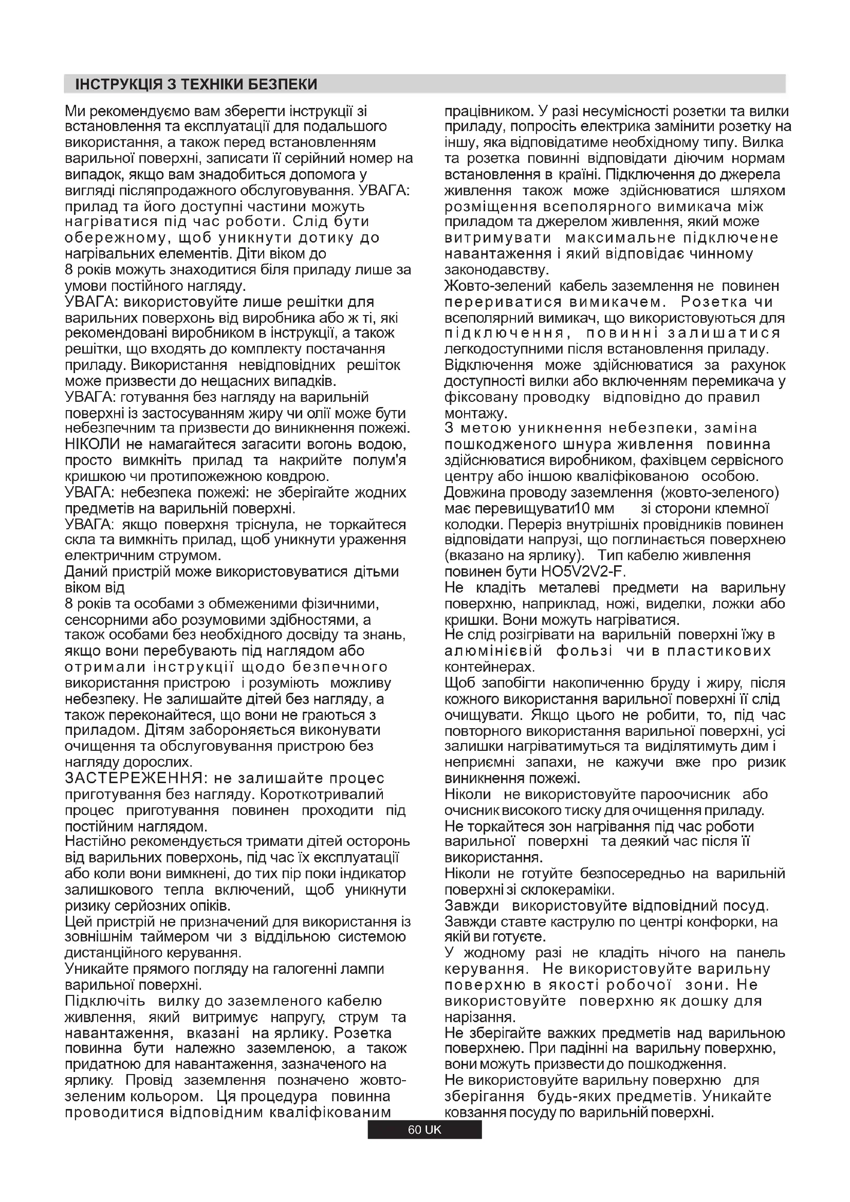 З метою уникнення небезпеки, заміна пошкодженого шнура живлення повинна здійснюватися виробником, фахівцем сервісного центру або іншою кваліфікованою особою. Довжина проводу заземлення (жовто-зеленого) має перевищувати зі сторони клемної10 мм колодки. Переріз внутрішніх провідників повинен відповідати напрузі, що поглинається поверхнею (вказано на ярлику). Тип кабелю живлення повинен бути HO5V2V2-F. Не кладіть металеві предмети на варильну поверхню, наприклад ножі виделки, ложки або,, кришки. Вони можуть нагріватися. Не слід розігрівати на варильній поверхні їжу в алюмінієвій фользі чи в пластикових контейнерах. Щоб запобігти накопиченню бруду і жиру, після кожного використання варильної поверхні її слід очищувати. Якщо цього не робити, то, під час повторного використання варильної поверхні, усі залишки нагріватимуться та виділятимуть дим і неприємні запахи, не кажучи вже про ризик виникнення пожежі. Ніколи не використовуйте пароочисник або очисник високого тиску для очищення приладу. Не торкайтеся зон нагрівання під час роботи варильної поверхні та деякий час після її використання. Ніколи не готуйте безпосередньо на варильній поверхні зі склокераміки. Завжди використовуйте відповідний посуд. Завжди ставте каструлю по центрі конфорки, на якійвиготуєте. У жодному разі не кладіть нічого на панель керування. Не використовуйте варильну поверхню в якості робочої зони. Не використовуйте поверхню як дошку для