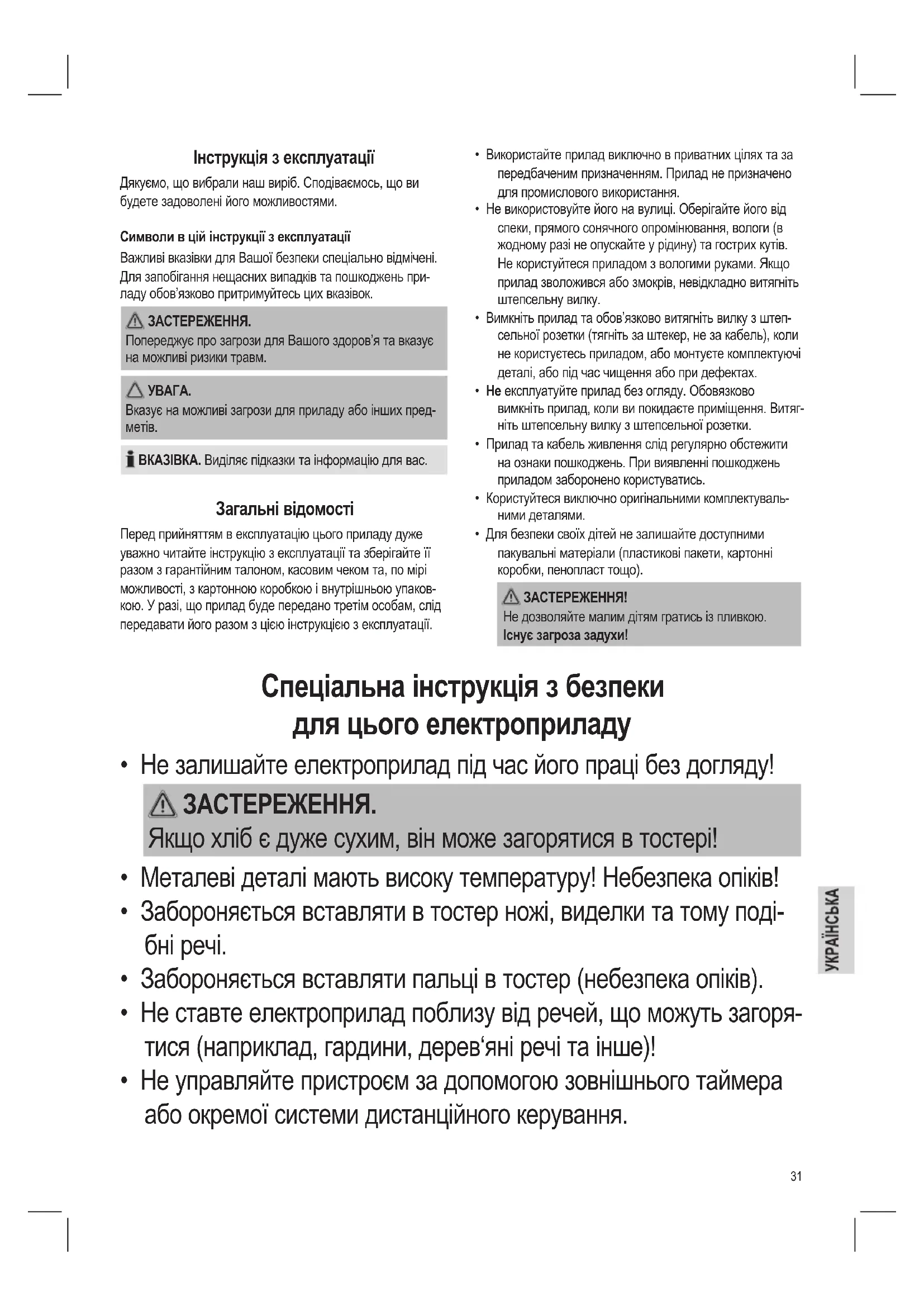 - Не залишайте електроприлад під час його праці без догляду! ЗАСТЕРЕЖЕННЯ. Якщо хліб є дуже сухим, він може загорятися в тостері!