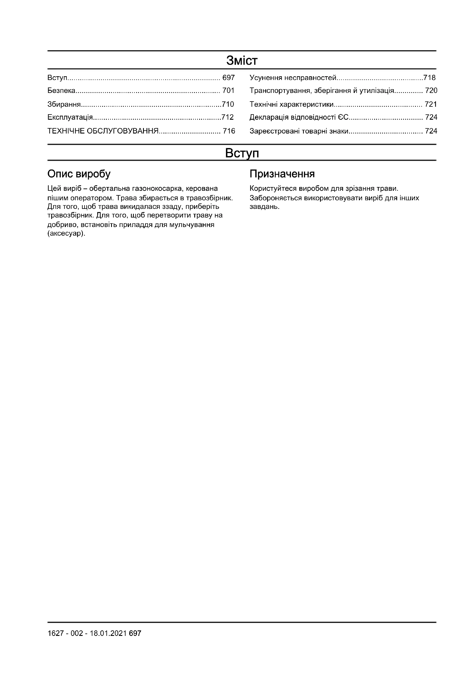 Опис виробу Цей виріб – обертальна газонокосарка, керована пішим оператором. Трава збирається в травозбірник. Для того, щоб трава викидалася ззаду, приберіть травозбірник. Для того, щоб перетворити траву на добриво, встановіть приладдя для мульчування (аксесуар). Призначення Користуйтеся виробом для зрізання трави. Забороняється використовувати виріб для інших