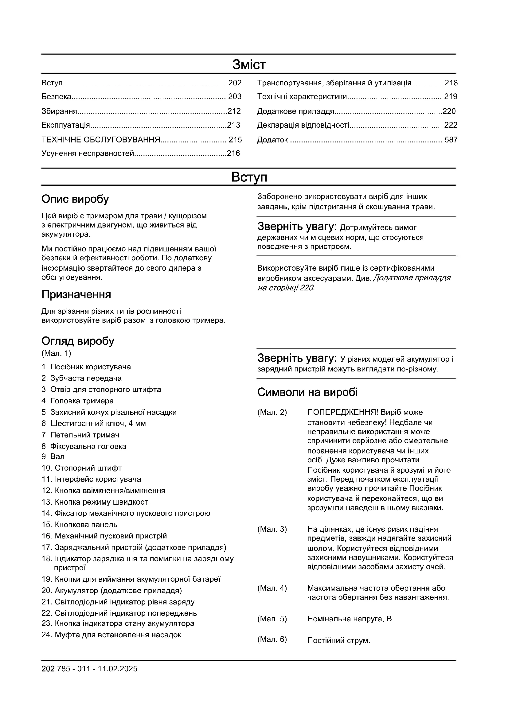 Зверніть увагу: У різних моделей акумулятор і зарядний пристрій можуть виглядати по-різному. Символи на виробі (Мал. 2) ПОПЕРЕДЖЕННЯ! Виріб може становити небезпеку! Недбале чи неправильне використання може спричинити серйозне або смертельне поранення користувача чи інших осіб. Дуже важливо прочитати Посібник користувача й зрозуміти його зміст. Перед початком експлуатації виробу уважно прочитайте Посібник користувача й переконайтеся, що ви зрозуміли наведені в ньому вказівки. (Мал. 3) На ділянках, де існує ризик падіння предметів, завжди надягайте захисний шолом. Користуйтеся відповідними захисними навушниками. Користуйтеся відповідними засобами захисту очей. (Мал. 4) Максимальна частота обертання або частота обертання без навантаження. (Мал. 5) Номінальна напруга, В (Мал. 6) Постійний струм. 202 785 - 011 - 11.02.2025(Мал. 7) З-під виробу можуть вилітати предмети, що може призвести до травм. (Мал. 8) Використовуйте лише неметалеві гнучкі насадки, такі як тримерна головка із тримерним шнуром. (Мал. 9) Виріб відповідає належним вимогам директив ЄС. (Мал. 10) Використовуйте відповідні захисні