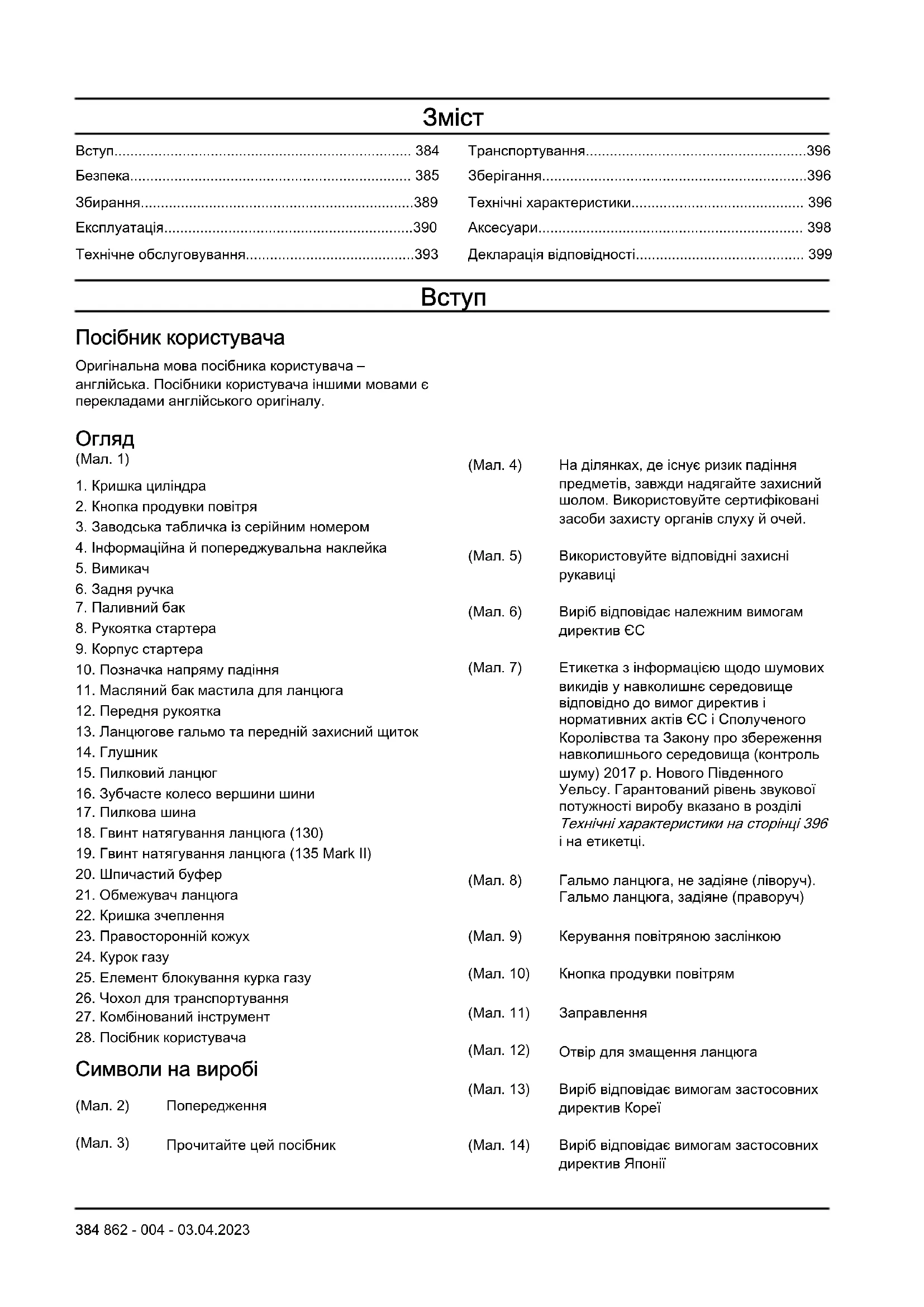(Мал. 6) Виріб відповідає належним вимогам директив ЄС (Мал. 7) Етикетка з інформацією щодо шумових викидів у навколишнє середовище відповідно до вимог директив і нормативних актів ЄС і Сполученого Королівства та Закону про збереження навколишнього середовища (контроль шуму) 2017р. Нового Південного Уельсу. Гарантований рівень звукової потужності виробу вказано в розділі Технічні характеристики на сторінці 396 і на етикетці. (Мал. 8) Гальмо ланцюга, не задіяне (ліворуч). Гальмо ланцюга, задіяне (праворуч) (Мал. 9) Керування повітряною заслінкою (Мал. 10) Кнопка продувки повітрям (Мал. 11) Заправлення (Мал. 12) Отвір для змащення ланцюга (Мал. 13) Виріб відповідає вимогам застосовних директив Кореї (Мал. 14) Виріб відповідає вимогам застосовних директив Японії 384 862 - 004 - 03.04.2023(Мал. 15) Міцно тримайте виріб обома руками (Мал. 16) Під час роботи не тримайте виріб однією рукою (Мал. 17) Не допускайте торкання об’єкта кінчиком різальної шини. (Мал. 18) Цей виріб відповідає вимогам застосовних норм Сполученого Королівства. Зверніть увагу: Інші позначення на виробі відповідають вимогам спеціальних сертифікатів для інших торгових зон. Законопроект 65 штату Каліфорнія WARNING! The engine exhaust from this product contains chemicals known to the State of California to cause cancer, birth defects or other reproductive harm. Відповідає вимогам європейського екологічного стандарту Євро-5 ПОПЕРЕДЖЕННЯ: Внесення змін у двигун позбавляє чинності сертифікацію ЄС для цього виробу. Відповідальність за якість продукції Згідно із законом про відповідальність за якість продукції ми не несемо відповідальності за будь-які пошкодження, спричинені роботою наших виробів,