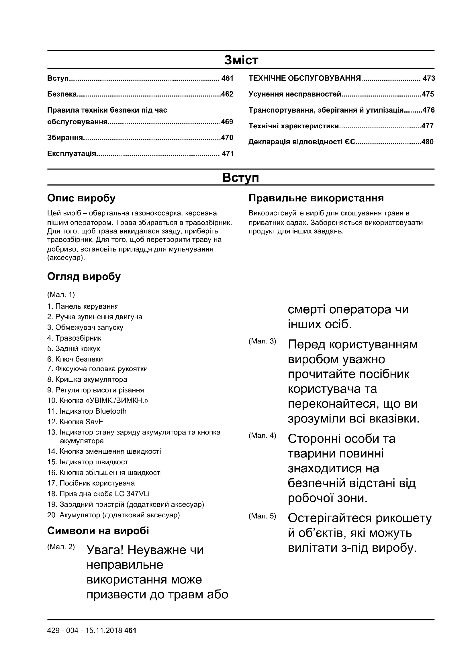 ПОПЕРЕДЖЕННЯ: Вказує на те, що в разі порушення інструкцій, наведених у цьому посібнику, існує небезпека поранення або смерті оператора чи інших осіб, що знаходяться поруч. 462 429 - 004 - 15.11.2018УВАГА: Вказує на те, що в разі порушення інструкцій, наведених у цьому посібнику, існує небезпека пошкодження виробу, інших матеріалів або навколишніх