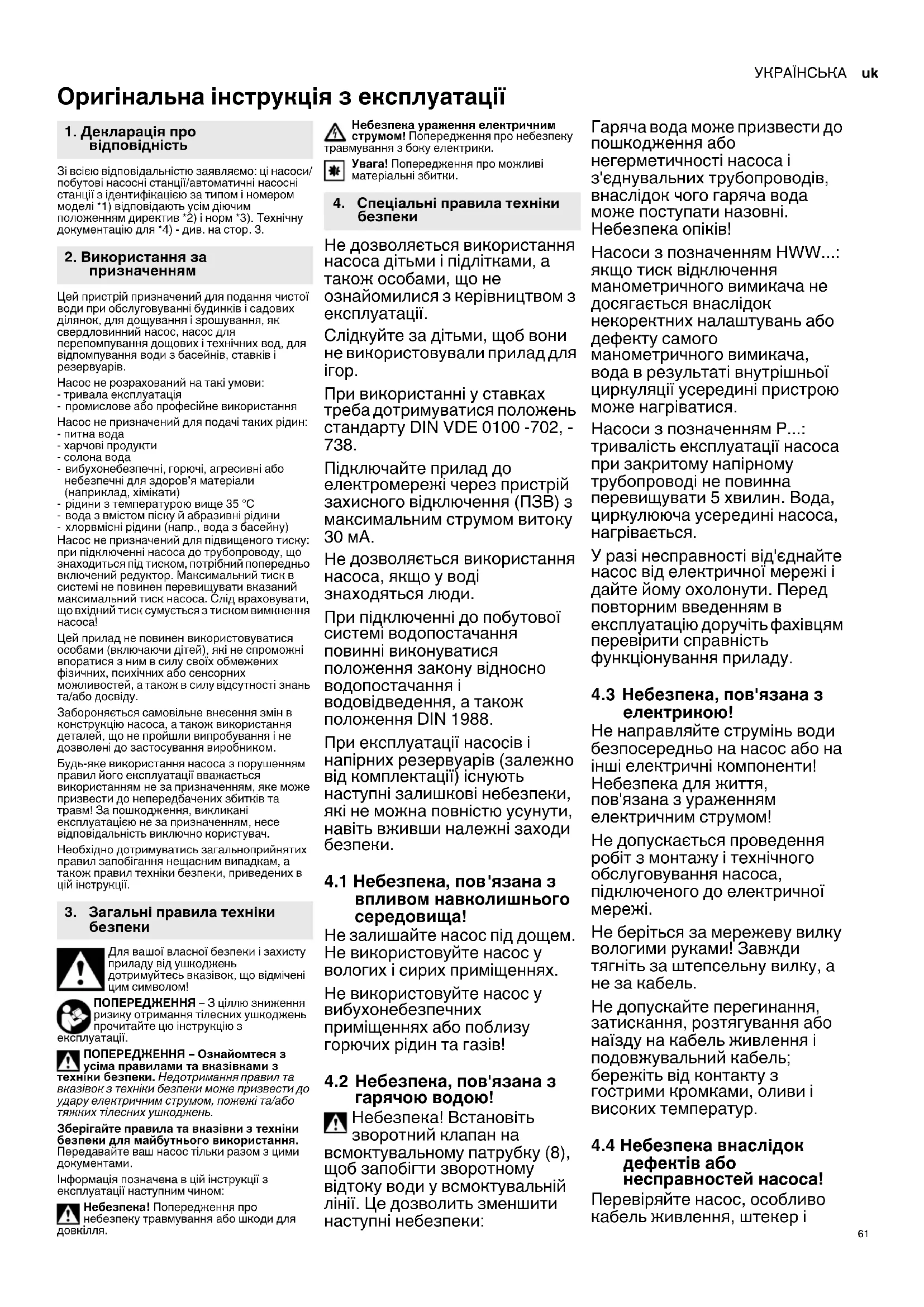 Небезпека ураження електричним струмом! Попередження про небезпеку травмування з боку електрики. Увага! Попередження про можливі матеріальні збитки. Не дозволяється використання насоса дітьми і підлітками, а також особами, що не ознайомилися з керівництвом з експлуатації. Слідкуйте за дітьми, щоб вони не використовували прилад для