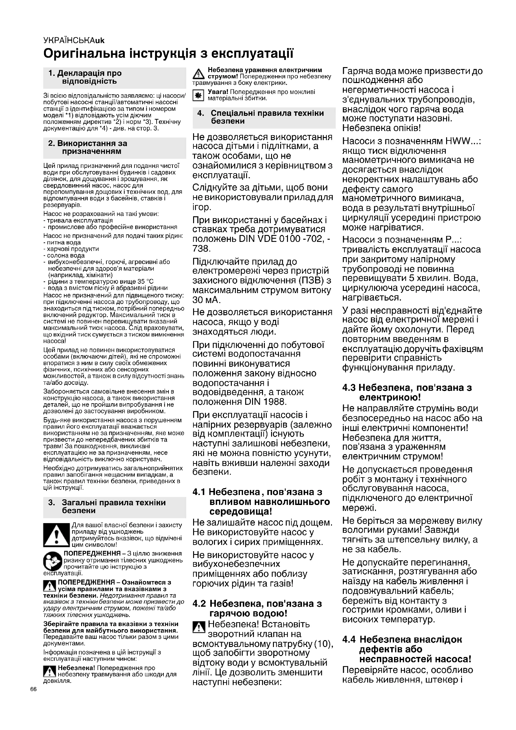 Не дозволяється використання насоса, якщо у воді знаходяться люди. При підключенні до побутової системі водопостачання повинні виконуватися положення закону відносно водопостачання і водовідведення, а також положення DIN 1988. При експлуатації насосів і напірних резервуарів (залежно від комплектації) існують наступні залишкові небезпеки, які не можна повністю усунути, навіть вживши належні заходи