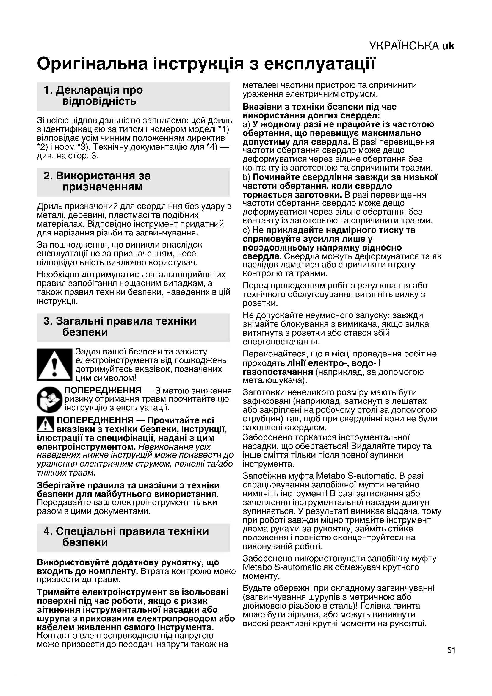 Не допускайте неумисного запуску: завжди знімайте блокування з вимикача, якщо вилка витягнута з розетки або стався збій енергопостачання. Переконайтеся, що в місці проведення робіт не проходять лінії електро-, водо- і газопостачання (наприклад, за допомогою металошукача). Заготовки невеликого розміру мають бути зафіксовані (наприклад, затиснуті в лещатах або закріплені на робочому столі за допомогою струбцин) так, щоб при свердлінні вони не були захоплені свердлом. Заборонено торкатися інструментальної насадки, що обертається! Видаляйте тирсу та інше сміття тільки після повної зупинки інструмента. Запобіжна муфта Metabo S-automatіc. В разі спрацьовування запобіжної муфти негайно вимкніть інструмент! В разі затискання або зачеплення інструментальної насадки двигун зупиняється. У результаті виникає віддача, тому при роботі завжди міцно тримайте інструмент двома руками за рукоятку, займіть стійке положення і повністю сконцентруйтеся на виконуваній роботі. Заборонено використовувати запобіжну муфту Metabo S-automatic як обмежувач крутного