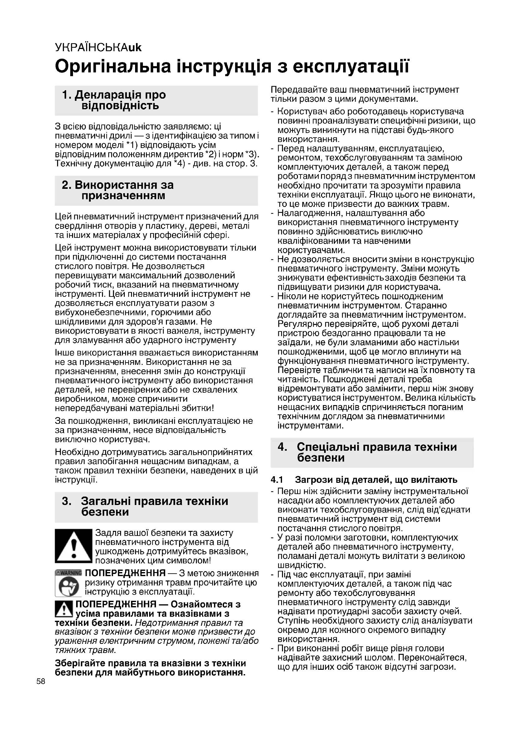 Оригінальна інструкція з експлуатації З всією відповідальністю заявляємо: ці пневматичні дрилі — з ідентифікацією за типом і номером моделі *1) відповідають усім відповідним положенням директив *2) і норм *3). Технічну документацію для *4) - див. на стор. 3. Цей пневматичний інструмент призначений для свердління отворів у пластику, дереві, металі та інших матеріалах у професійній сфері. Цей інструмент можна використовувати тільки при підключенні до системи постачання стислого повітря. Не дозволяється перевищувати максимальний дозволений робочий тиск, вказаний на пневматичному інструменті. Цей пневматичний інструмент не дозволяється експлуатувати разом з вибухонебезпечними, горючими або шкідливими для здоров'я газами. Не використовувати в якості важеля, інструменту для зламування або ударного інструменту Інше використання вважається використанням не за призначенням. Використання