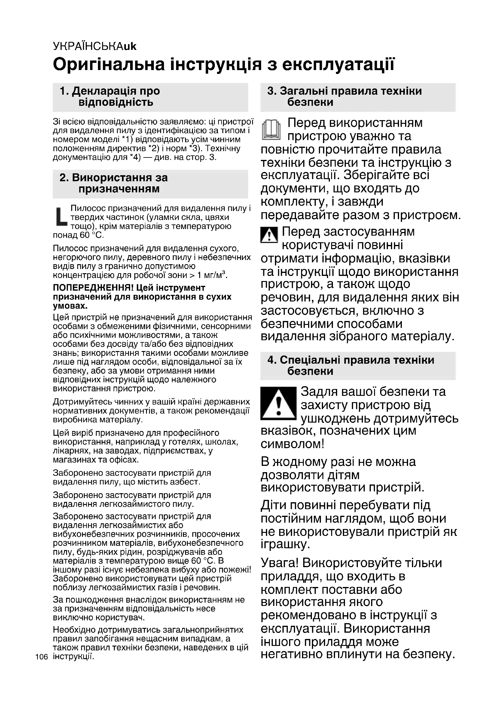 Обережно! Перед початком роботи з пристроєм необхідно прочитати інструкцію з експлуатації! ПОПЕРЕДЖЕННЯ: експлуатуючий персонал повинен бути належним чином проінструктований щодо правил експлуатації цього пилососа. Попереджувальна табличка для пристроїв, призначених для видалення пилу класу L: Пристрій призначений для видалення потенційно небезпечних для здоров'я речовин. Пристрій непридатний для очищення повітря від деревного пилу. Пил, що виникає під час обробки матеріалів, які містять свинець, деяких видів деревини, мінералів і металів, може бути небезпечним для здоров'я. Вдихання часток такого пилу або контакт з ним може стати причиною алергічних реакцій та/ або захворювань дихальних шляхів користувача або осіб, що знаходяться поруч. Деякі види пилу (наприклад пил,УКРАЇНСЬКА uk
