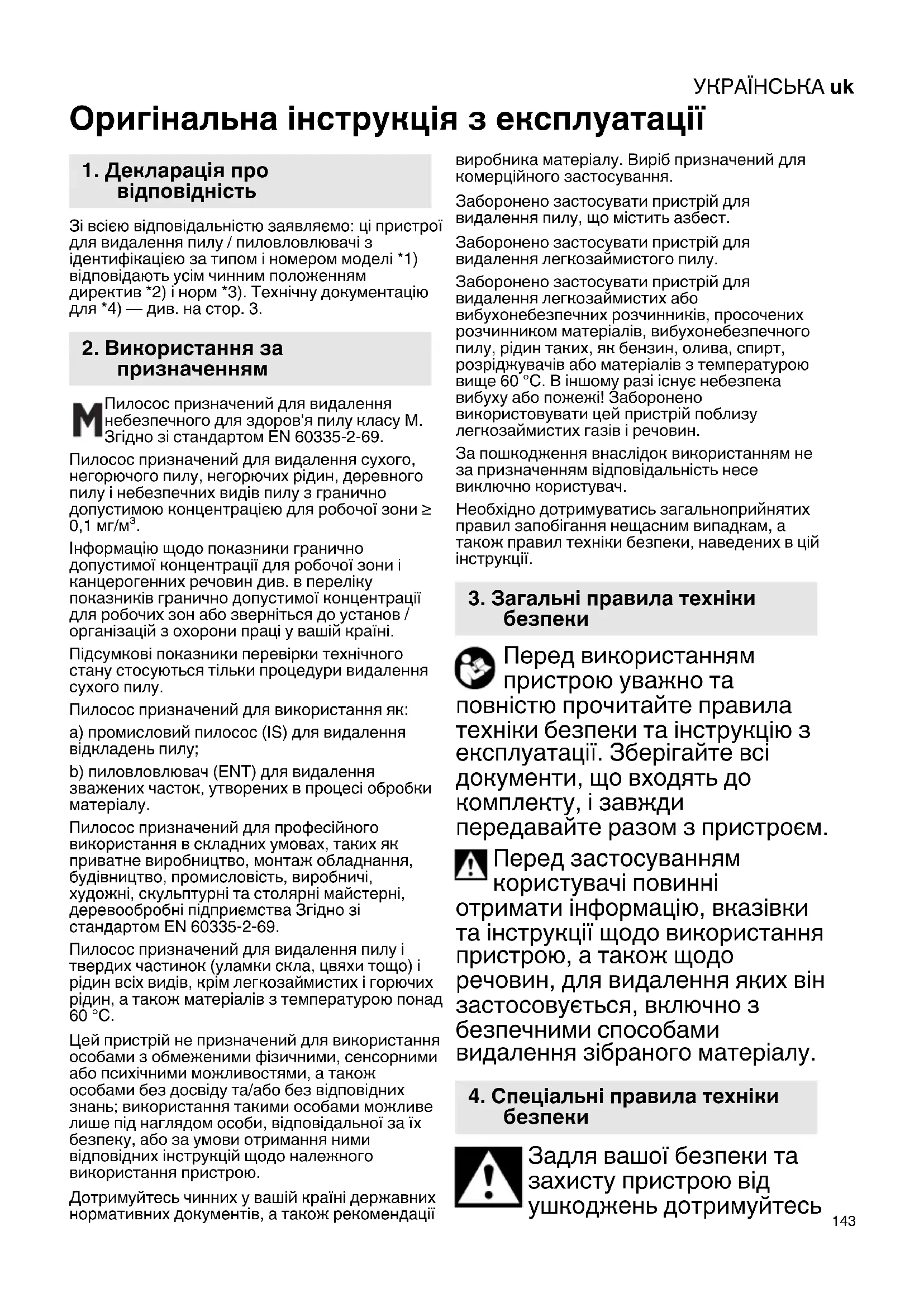 Оригінальна інструкція з експлуатації Зі всією відповідальністю заявляємо: ці пристрої для видалення пилу / пиловловлювачі з ідентифікацією за типом і номером моделі *1) відповідають усім чинним положенням директив *2) і норм *3). Технічну документацію для *4) — див. на стор. 3. Пилосос призначений для видалення небезпечного для здоров'я пилу класу M. Згідно зі стандартом EN 60335-2-69. Пилосос призначений для видалення сухого, негорючого пилу, негорючих рідин, деревного пилу і небезпечних видів пилу з гранично допустимою концентрацією для робочої зони ≥ 0,1 мг/м³. Інформацію щодо показники гранично допустимої концентрації для робочої зони і канцерогенних речовин див. в переліку показників гранично допустимої концентрації для робочих зон або зверніться до установ / організацій з охорони праці у вашій країні. Підсумкові показники перевірки технічного стану стосуються тільки процедури видалення сухого пилу. Пилосос призначений для використання як: a) промисловий пилосос (IS) для видалення відкладень пилу; b) пиловловлювач (ENT) для видалення зважених часток, утворених в процесі обробки