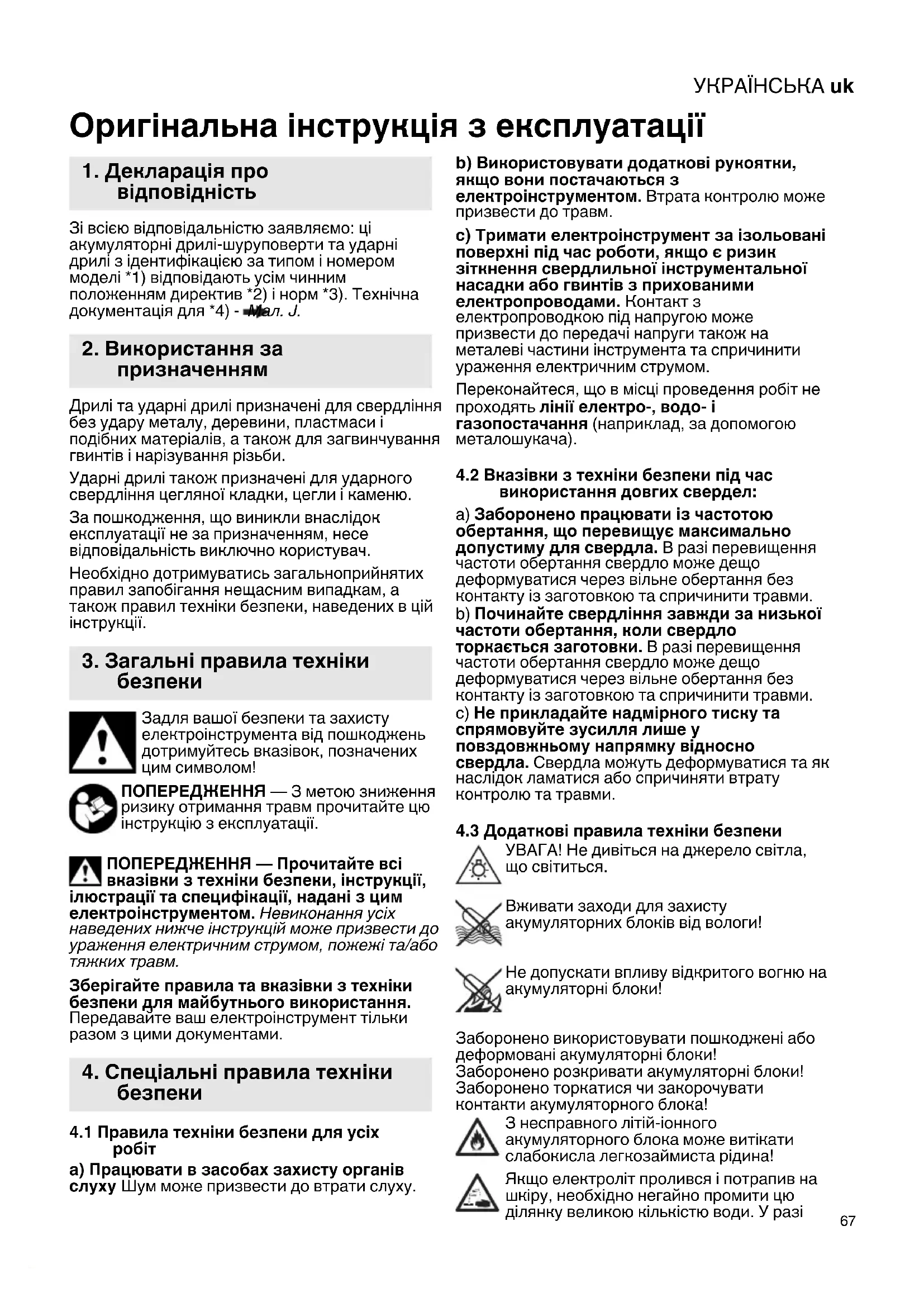 Зі всією відповідальністю заявляємо: ці акумуляторні дрилі-шуруповерти та ударні дрилі з ідентифікацією за типом і номером моделі *1) відповідають усім чинним положенням директив *2) і норм *3). Технічна документація для *4) - Мал. J. Дрилі та ударні дрилі призначені для свердління без удару металу, деревини, пластмаси і подібних матеріалів, а також для загвинчування гвинтів і нарізування різьби. Ударні дрилі також призначені для ударного свердління цегляної кладки, цегли і каменю. За пошкодження, що виникли внаслідок експлуатації не за призначенням, несе відповідальність виключно користувач. Необхідно дотримуватись загальноприйнятих правил запобігання нещасним випадкам, а також правил техніки безпеки, наведених в цій інструкції. Задля вашої безпеки та захисту електроінструмента від пошкоджень дотримуйтесь вказівок, позначених цим символом! ПОПЕРЕДЖЕННЯ — З метою зниження ризику отримання травм прочитайте цю інструкцію з експлуатації. ПОПЕРЕДЖЕННЯ — Прочитайте всі вказівки з техніки безпеки, інструкції, ілюстрації та специфікації, надані з цим електроінструментом. Невиконання усіх наведених нижче інструкцій може призвести до ураження електричним струмом, пожежі та/або тяжких травм. Зберігайте правила та вказівки з техніки безпеки для майбутнього використання. Передавайте ваш електроінструмент тільки разом з цими документами.