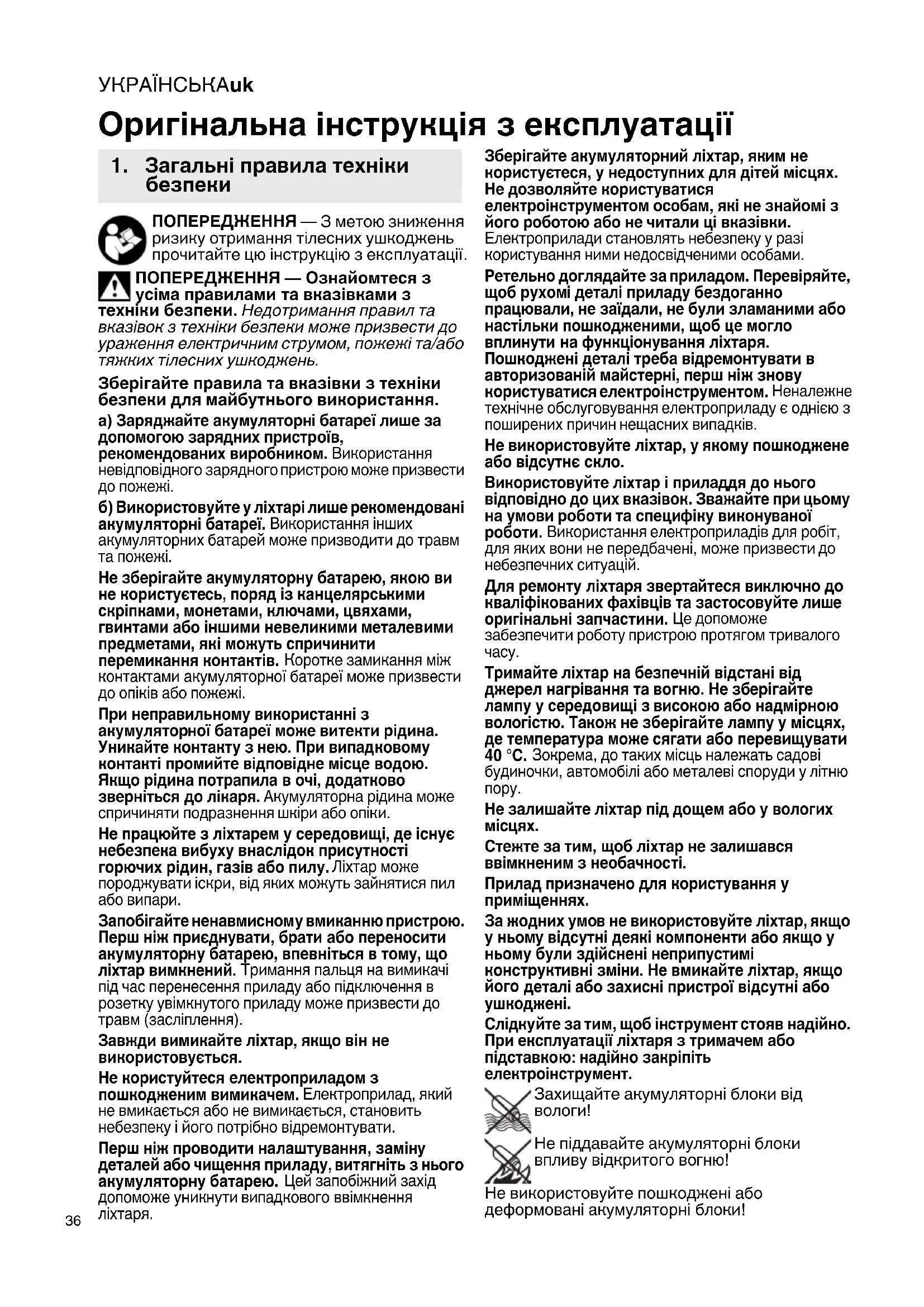 Не зберігайте акумуляторну батарею, якою ви не користуєтесь, поряд із канцелярськими скріпками, монетами, ключами, цвяхами, гвинтами або іншими невеликими металевими предметами, які можуть спричинити перемикання контактів. Коротке замикання між контактами акумуляторної батареї може призвести до опіків або пожежі. При неправильному використанні з акумуляторної батареї може витекти рідина. Уникайте контакту з нею. При випадковому контакті промийте відповідне місце водою. Якщо рідина потрапила в очі, додатково зверніться до лікаря. Акумуляторна рідина може спричиняти подразнення шкіри або опіки. Не працюйте з ліхтарем у середовищі, де існує небезпека вибуху внаслідок присутності горючих рідин, газів або пилу. Ліхтар може породжувати іскри, від яких можуть зайнятися пил або випари. Запобігайте ненавмисному вмиканню пристрою. Перш ніж приєднувати, брати або переносити акумуляторну батарею, впевніться в тому, що ліхтар вимкнений. Тримання пальця на вимикачі під час перенесення приладу або підключення в розетку увімкнутого приладу може призвести до травм (засліплення). Завжди вимикайте ліхтар, якщо він не використовується. Не користуйтеся електроприладом з пошкодженим вимикачем. Електроприлад, який не вмикається або не вимикається, становить небезпеку і його потрібно відремонтувати. Перш ніж проводити налаштування, заміну деталей або чищення приладу, витягніть з нього акумуляторну батарею. Цей запобіжний захід допоможе уникнути випадкового ввімкнення