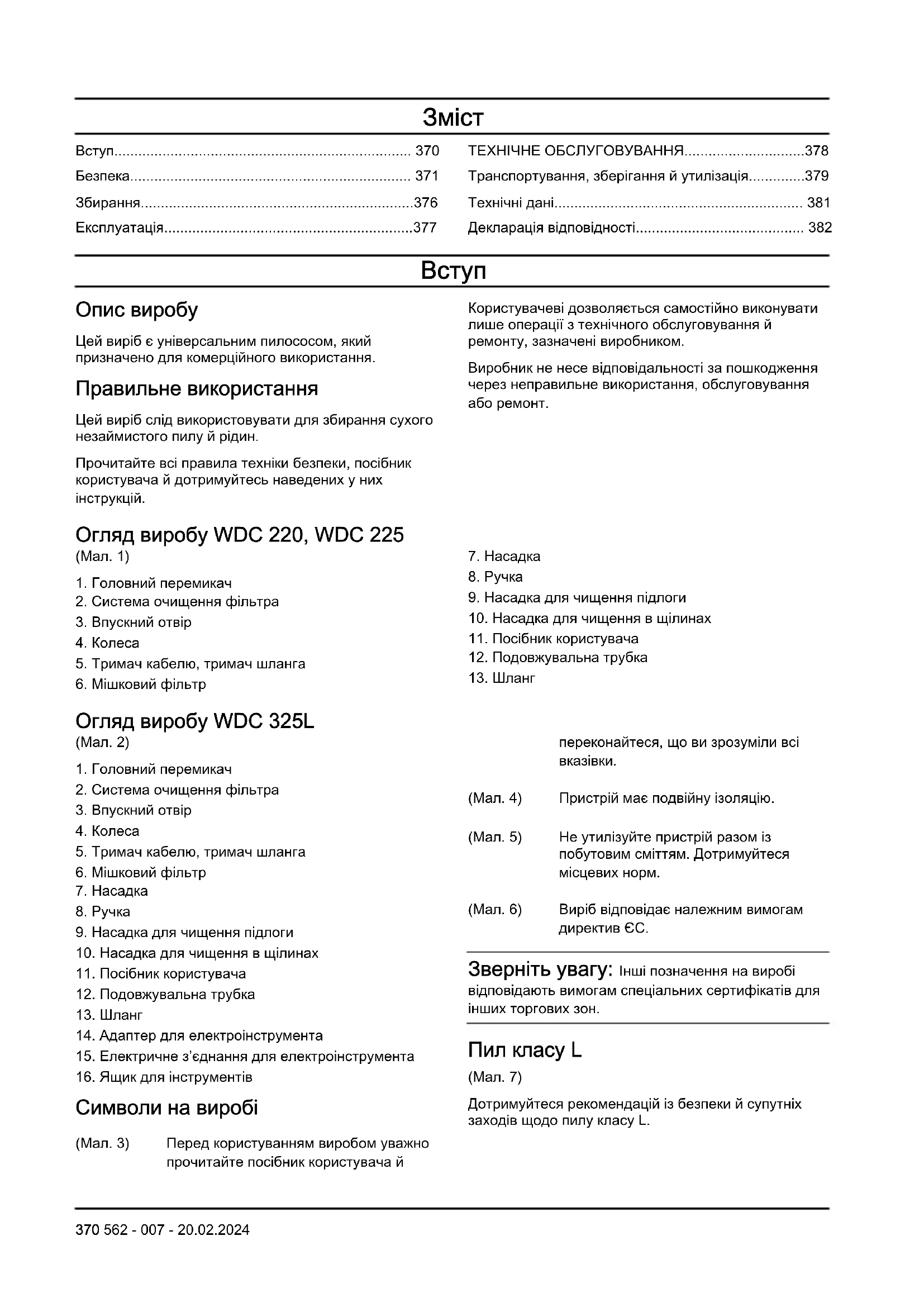 (Мал. 4) Пристрій має подвійну ізоляцію. (Мал. 5) Не утилізуйте пристрій разом із побутовим сміттям. Дотримуйтеся місцевих норм. (Мал. 6) Виріб відповідає належним вимогам директив ЄС. Зверніть увагу: Інші позначення на виробі відповідають вимогам спеціальних сертифікатів для інших торгових зон. Пил класу L (Мал. 7) Дотримуйтеся рекомендацій із безпеки й супутніх заходів щодо пилу класу L. 370 562 - 007 - 20.02.2024Пошкодження виробу Ми не несемо відповідальності за пошкодження,