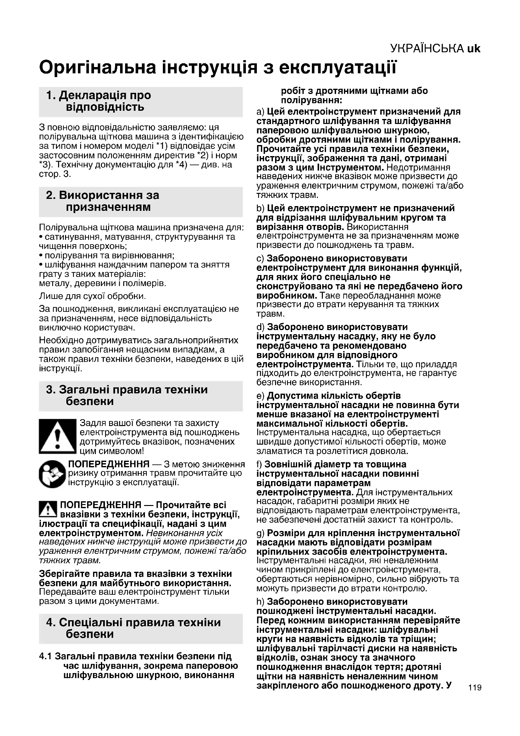 - шліфування наждачним папером та зняття грату з таких матеріалів: металу, деревини і полімерів. Лише для сухої обробки. За пошкодження, викликані експлуатацією не за призначенням, несе відповідальність виключно користувач. Необхідно дотримуватись загальноприйнятих правил запобігання нещасним випадкам, а також правил техніки безпеки, наведених в цій інструкції. Задля вашої безпеки та захисту електроінструмента від пошкоджень дотримуйтесь вказівок, позначених цим символом! ПОПЕРЕДЖЕННЯ — З метою зниження ризику отримання травм прочитайте цю інструкцію з експлуатації. ПОПЕРЕДЖЕННЯ — Прочитайте всі вказівки з техніки безпеки, інструкції, ілюстрації та специфікації, надані з цим електроінструментом. Невиконання усіх наведених нижче інструкцій може призвести до ураження електричним струмом, пожежі та/або тяжких травм. Зберігайте правила та вказівки з техніки безпеки для майбутнього використання. Передавайте ваш електроінструмент тільки разом з цими документами.