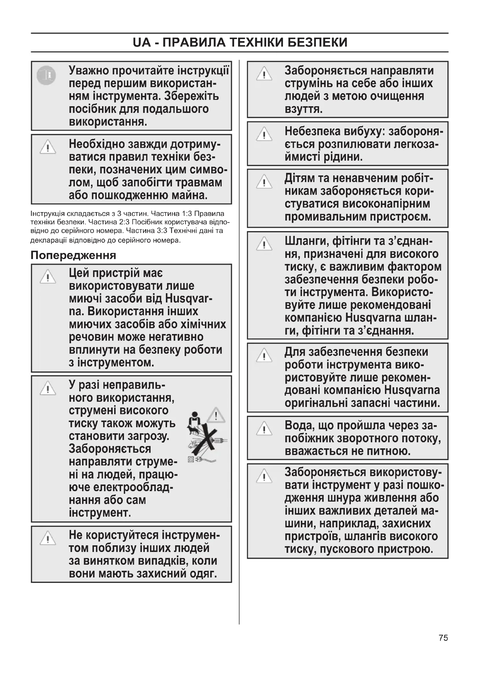 - Свернуть шнур питания и шланг высокого давления во избежание повреждения шнура, вилки, шланга и креплений. Хранить машину следует при температуре выше нуля. См. иллюстрации в разделе F. G Обслуживание, осмотр и ремонт После длительного хранения перед использованием требуется провести обслуживание машины. Перед использованием необходимо осматривать машину и оборудование на наличие повреждений. При выявлении повреждений следует действовать в соответствии с приведенными предупреждениями. Нельзя выполнять какие-либо работы по обслуживанию помимо тех, которые описаны в данном руководстве. Если машина не запускается, останавливается, вибрирует, в случае колебаний давления, проблем с двигателем, перегорания предохранителя или утечки воды сверьтесь со схемой поиска и устранения неисправностей на веб-сайте www.husqvarna.com. Ремонтные работы любого рода выполняются только в мастерских, уполномоченных компанией Husqvarna, с использованием фирменных запчастей производства Husqvarna. Обслуживание осуществляется в соответствии с иллюстрациями в разделе G. OM 1-3 Safety FINAL rev 1 draft.indd 74 2017-06-14 13:59:5875 UA - ПРАВИЛА ТЕХНІКИ БЕЗПЕКИ Уважно прочитайте інструкції перед першим використан- ням інструмента. Збережіть посібник для подальшого використання. Необхідно завжди дотриму- ватися правил техніки без- пеки, позначених цим симво- лом, щоб запобігти травмам або пошкодженню майна. Інструкція складається з 3 частин. Частина 1:3 Правила техніки безпеки. Частина 2:3 Посібник користувача відпо- відно до серійного номера. Частина 3:3 Технічні дані та декларації відповідно до серійного номера. Попередження Цей пристрій має використовувати лише миючі засоби від Husqvar- na. Використання інших миючих засобів або хімічних речовин може негативно вплинути на безпеку роботи з інструментом. У разі неправиль- ного використання, струмені високого тиску також можуть становити загрозу. Забороняється направляти струме- ні на людей, працю- юче електрооблад- нання або сам інструмент. Не користуйтеся інструмен- том поблизу інших людей за винятком випадків, коли вони мають захисний одяг. Забороняється направляти струмінь на себе або інших людей з метою очищення
