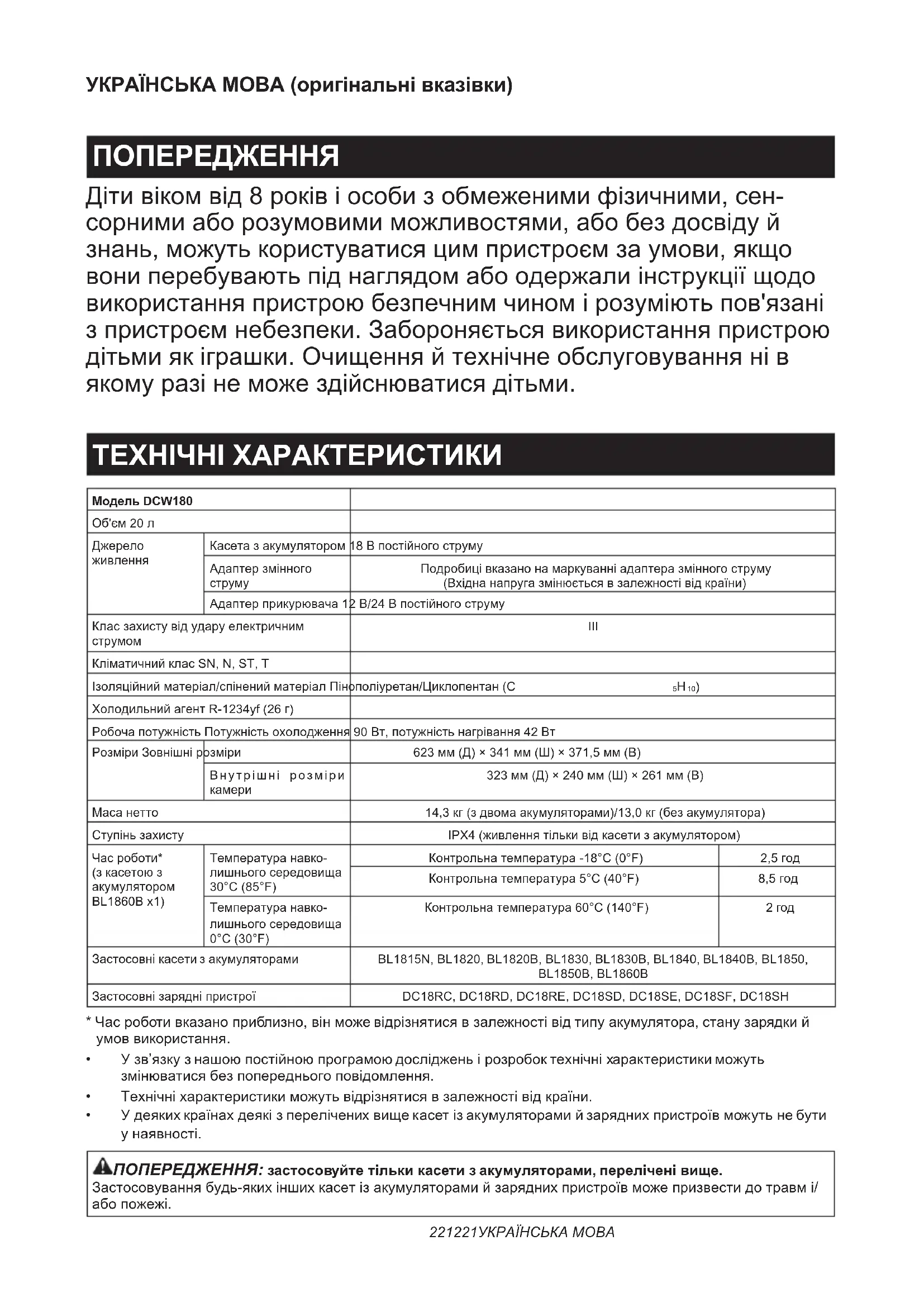 - Acumulator și încărcător originale Makita NOTĂ: Unele articole din listă pot incluse în pache- tul cu unelte ca accesorii standard. Acestea pot varia în funcție de țară. ROMÂNĂ221221 УКРАЇНСЬКА МОВА УКРАЇНСЬКА МОВА (оригінальні вказівки) ПОПЕРЕДЖЕННЯ Діти віком від 8 років і особи з обмеженими фізичними, сен- сорними або розумовими можливостями, або без досвіду й знань, можуть користуватися цим пристроєм за умови, якщо вони перебувають під наглядом або одержали інструкції щодо використання пристрою безпечним чином і розуміють пов'язані з пристроєм небезпеки. Забороняється використання пристрою дітьми як іграшки. Очищення й технічне обслуговування ні в якому разі не може здійснюватися дітьми. ТЕХНІЧНІ ХАРАКТЕРИСТИКИ Модель DCW180Об'єм 20 лДжерело живленняКасета з акумулятором 18 В постійного струмуАдаптер змінного струмуПодробиці вказано на маркуванні адаптера змінного струму(Вхідна напруга змінюється в залежності від країни)Адаптер прикурювача 12 В/24 В постійного струмуКлас захисту від удару електричним струмом III Кліматичний клас SN, N, ST, TІзоляційний матеріал/спінений матеріал Пінополіуретан/Циклопентан (C