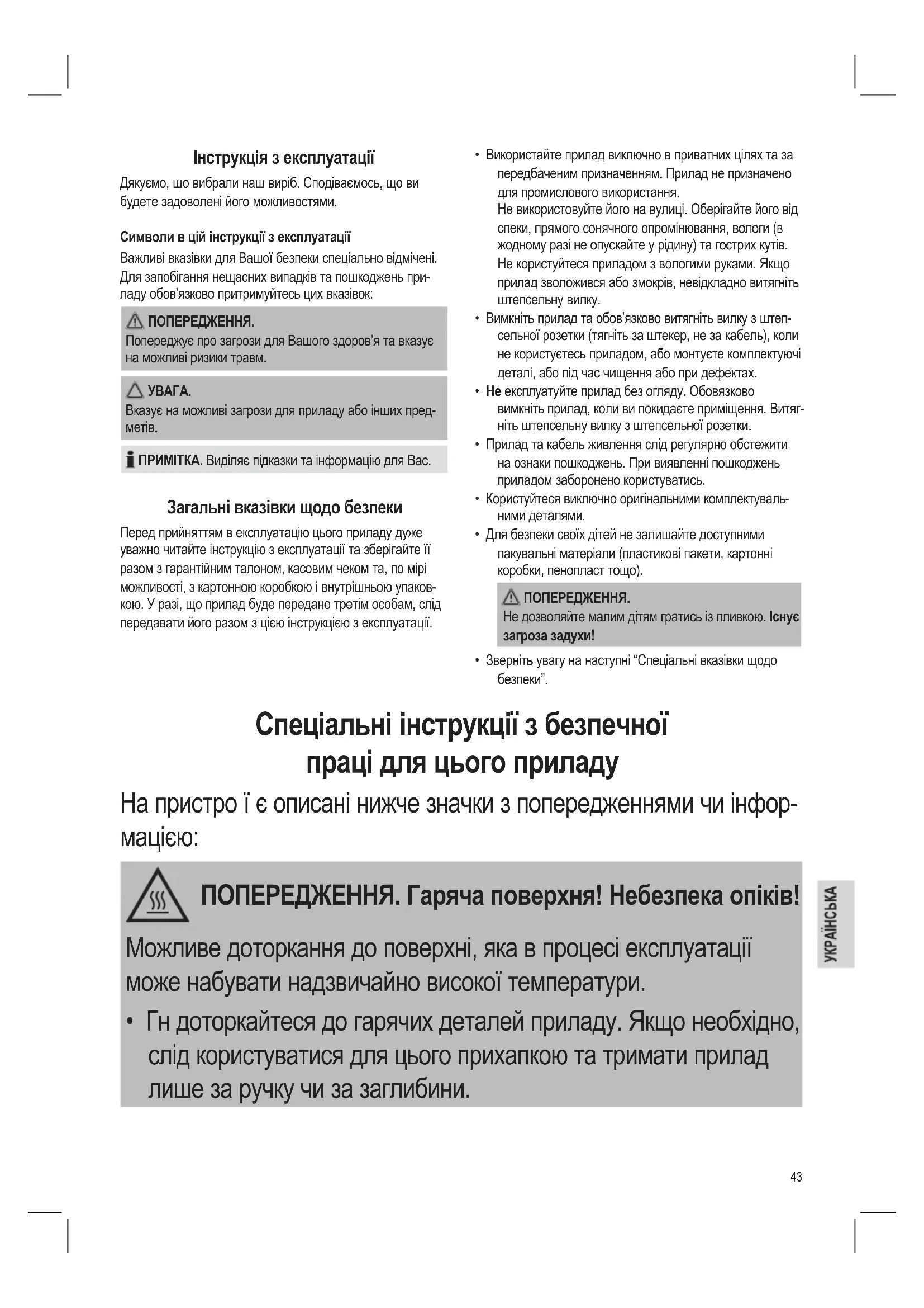 - Гн доторкайтеся до гарячих деталей приладу. Якщо необхідно, слід користуватися для цього прихапкою та тримати прилад лише за ручку чи за заглибини.44 ПОПЕРЕДЖЕННЯ.