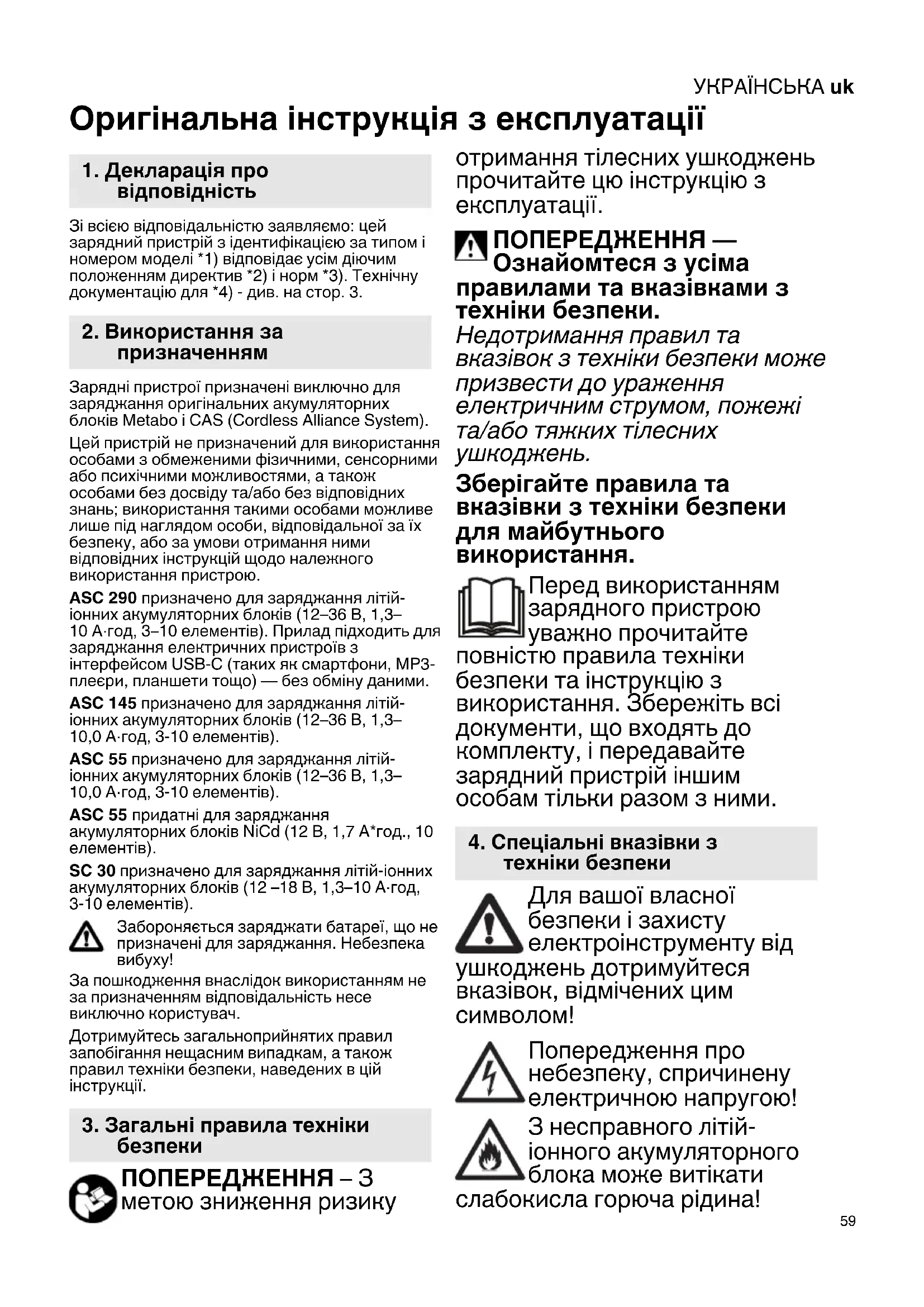 Оригінальна інструкція з експлуатації Зі всією відповідальністю заявляємо: цей зарядний пристрій з ідентифікацією за типом і номером моделі *1) відповідає усім діючим положенням директив *2) і норм *3). Технічну документацію для *4) - див. на стор. 3. Зарядні пристрої призначені виключно для заряджання оригінальних акумуляторних блоків Metabo i CAS (Cordless Alliance System). Цей пристрій не призначений для використання особами з обмеженими фізичними, сенсорними або психічними можливостями, а також особами без досвіду та/або без відповідних знань; використання такими особами можливе лише під наглядом особи, відповідальної за їх безпеку, або за умови отримання ними відповідних інструкцій щодо належного використання пристрою. ASC 290 призначено для заряджання літій- іонних акумуляторних блоків (12–36 В, 1,3– 10 А·год, 3–10 елементів). Прилад підходить для заряджання електричних пристроїв з інтерфейсом USB-C (таких як смартфони, MP3- плеєри, планшети тощо) — без обміну даними. ASC 145 призначено для заряджання літій- іонних акумуляторних блоків (12–36 В, 1,3– 10,0 A·год, 3-10 елементів). ASC 55 призначено для заряджання літій- іонних акумуляторних блоків (12–36 В, 1,3– 10,0 A·год, 3-10 елементів). ASC 55 придатні для заряджання акумуляторних блоків NiCd (12 В, 1,7 A*год., 10 елементів). SC 30 призначено для заряджання літій-іонних акумуляторних блоків (12 –18 В, 1,3–10 A·год, 3-10 елементів). Забороняється заряджати батареї, що не призначені для заряджання. Небезпека