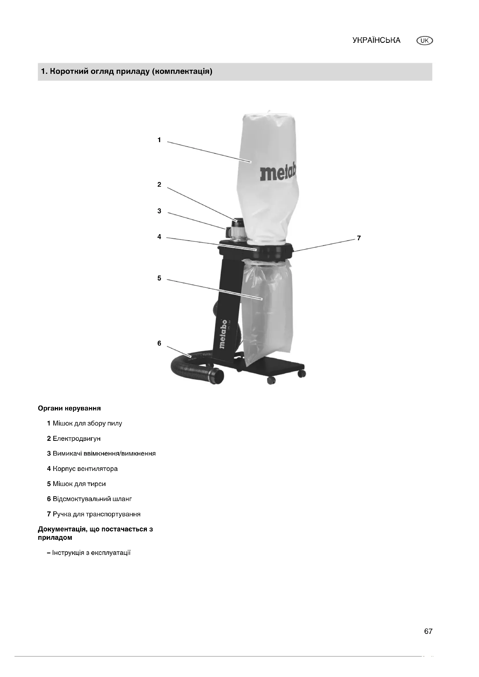 Органи керування 1 Мішок для збору пилу 2 Електродвигун 3 Вимикачі ввімкнення/вимкнення 4 Корпус вентилятора 5 Мішок для тирси 6 Відсмоктувальний шланг 7 Ручка для транспортування Документація, що постачається з