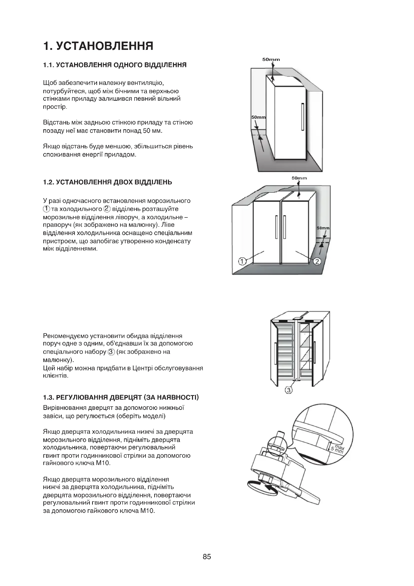 1.3. РЕГУЛЮВАННЯ ДВЕРЦЯТ (ЗА НАЯВНОСТІ) Вирівнюваннядверцятзадопомогоюнижньої завіси,щорегулюється(оберітьмоделі) Якщодверцятахолодильниканижчізадверцята морозильноговідділення,піднімітьдверцята холодильника,повертаючирегулювальний гвинтпротигодинниковоїстрілкизадопомогою гайковогоключаМ10. Якщодверцятаморозильноговідділення нижчізадверцятахолодильника,підніміть дверцятаморозильноговідділення,повертаючи регулювальнийгвинтпротигодинниковоїстрілки задопомогоюгайковогоключаМ10. 50mm 50mm 5 mm max86