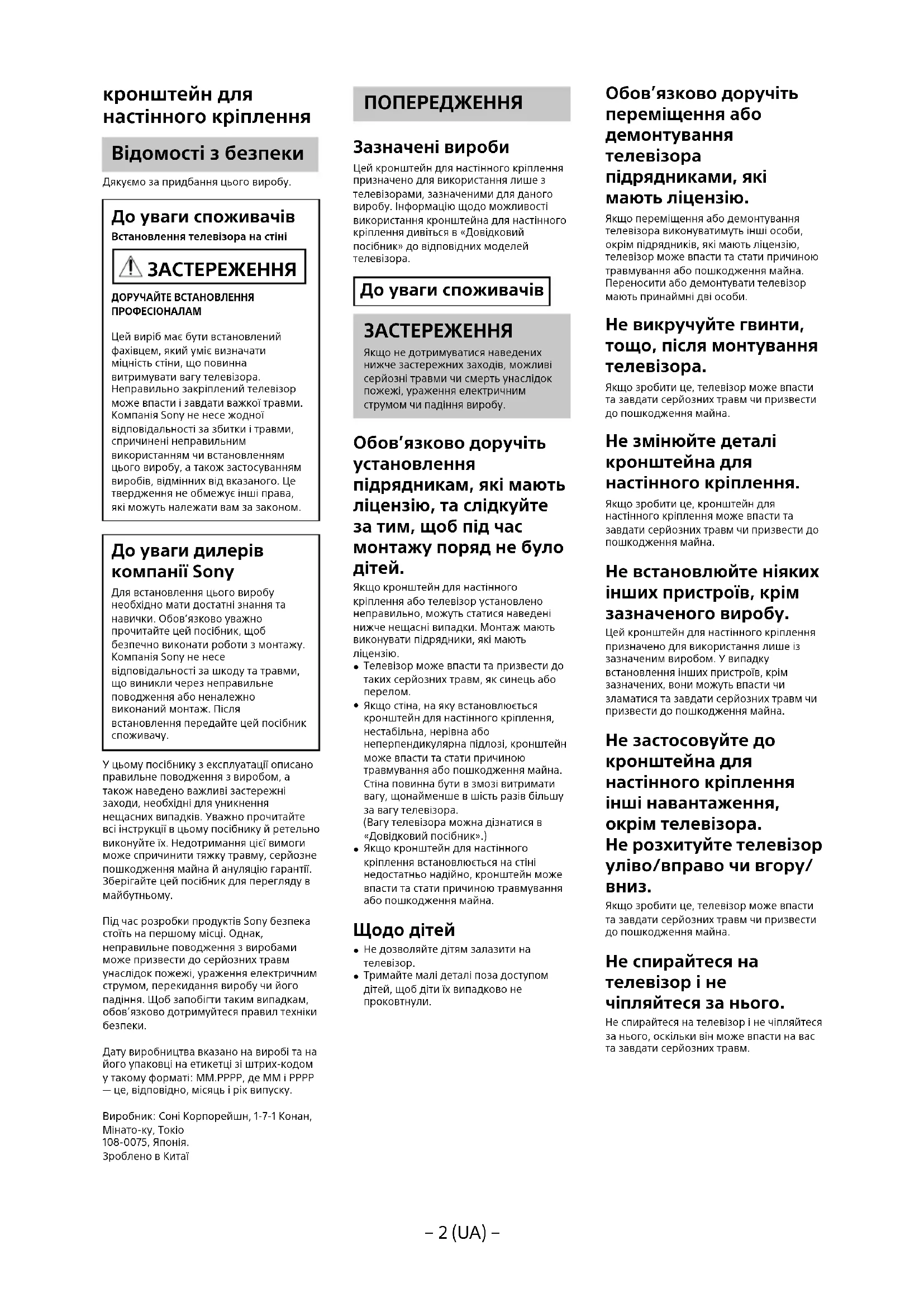 Дату виробництва вказано на виробі та на його упаковці на етикетці зі штрих-кодом у такому форматі: ММ.РРРР, де ММ і РРРР — це, відповідно, місяць і рік випуску. Виробник: Соні Корпорейшн, 1-7-1 Конан, Мінато-ку, Токіо 108-0075, Японія. Зроблено в Китаї ПОПЕРЕДЖЕННЯ Зазначені вироби Цей кронштейн для настінного кріплення призначено для використання лише з телевізорами, зазначеними для даного виробу. Інформацію щодо можливості використання кронштейна для настінного кріплення дивіться в «Довідковий посібник» до відповідних моделей телевізора. До уваги споживачів ЗАСТЕРЕЖЕННЯ Якщо не дотримуватися наведених нижче застережних заходів, можливі серйозні травми чи смерть унаслідок пожежі, ураження електричним струмом чи падіння виробу. Обов’язково доручіть установлення підрядникам, які мають ліцензію, та слідкуйте за тим, щоб під час монтажу поряд не було