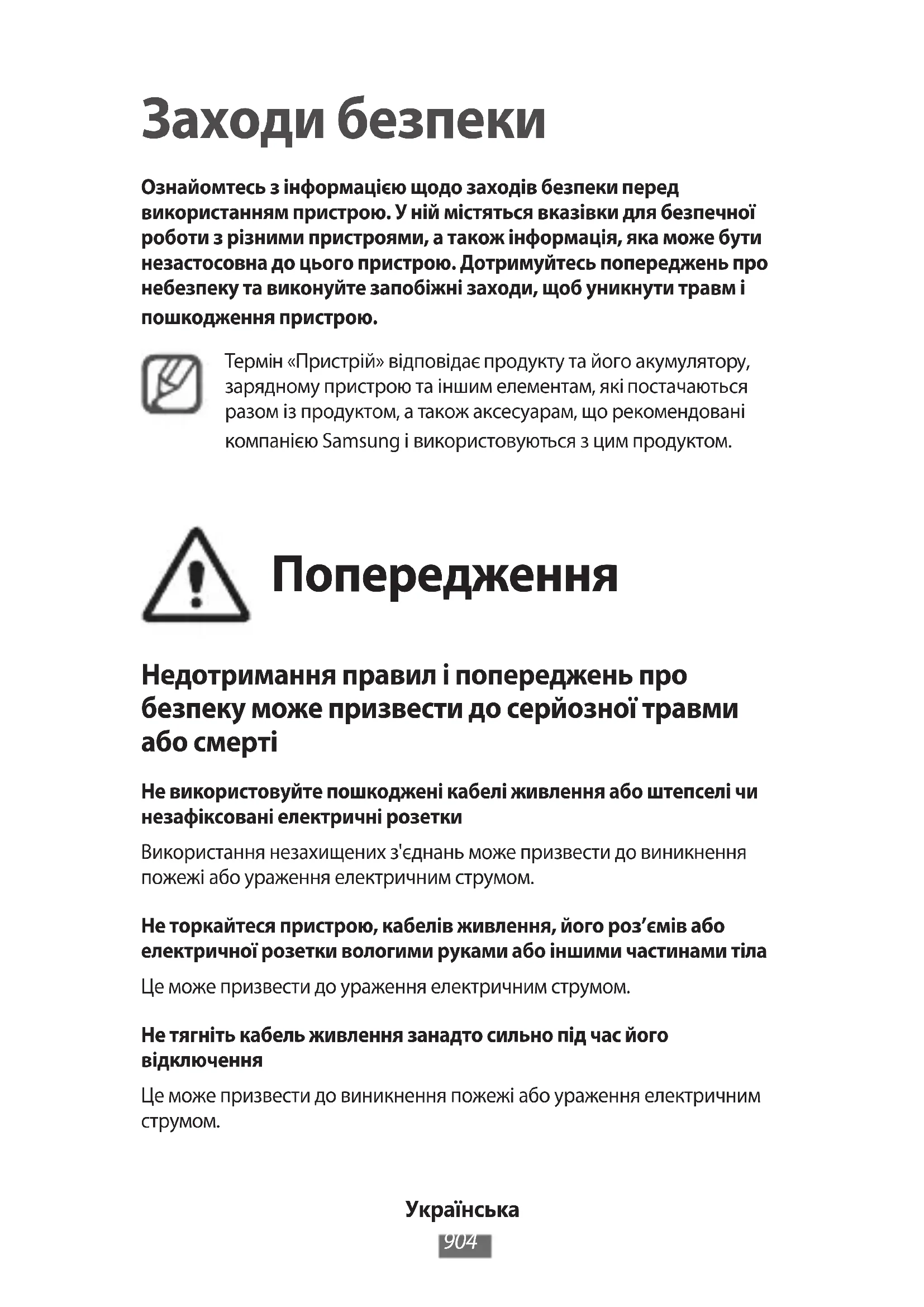 Заходи безпеки Ознайомтесь з інформацією щодо заходів безпеки перед використанням пристрою. У ній містяться вказівки для безпечної роботи з різними пристроями, а також інформація, яка може бути незастосовна до цього пристрою. Дотримуйтесь попереджень про небезпеку та виконуйте запобіжні заходи, щоб уникнути травм і пошкодження пристрою. Термін «Пристрій» відповідає продукту та його акумулятору, зарядному пристрою та іншим елементам, які постачаються разом із продуктом, а також аксесуарам, що рекомендовані компанією Samsung і використовуються з цим продуктом. Попередження Недотримання правил і попереджень про безпеку може призвести до серйозної травми