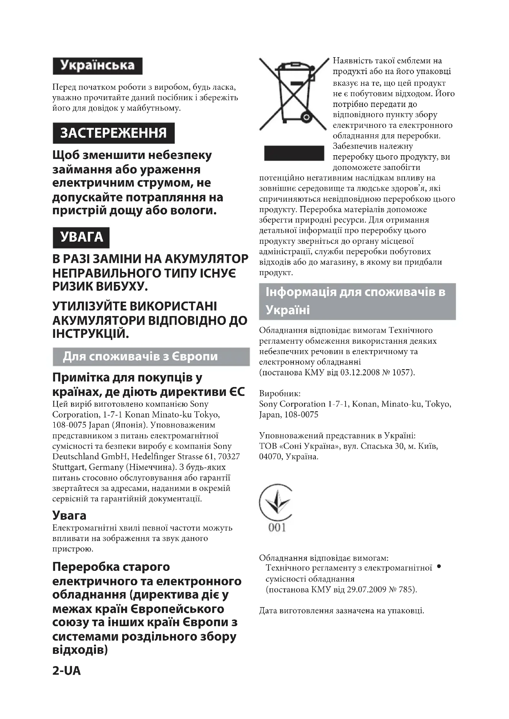 В РАЗІ ЗАМІНИ НА АКУМУЛЯТОР НЕПРАВИЛЬНОГО ТИПУ ІСНУЄ РИЗИК ВИБУХУ. УТИЛІЗУЙТЕ ВИКОРИСТАНІ АКУМУЛЯТОРИ ВІДПОВІДНО ДО ІНСТРУКЦІЙ. Для споживачів з Європи Примітка для покупців у країнах, де діють директиви ЄС Цей виріб виготовлено компанією Sony Corporation, 1-7-1 Konan Minato-ku Tokyo, 108-0075 Japan (Японія). Уповноваженим представником з питань електромагнітної сумісності та безпеки виробу є компанія Sony Deutschland GmbH, Hedelfinger Strasse 61, 70327 Stuttgart, Germany (Німеччина). З будь-яких питань стосовно обслуговування або гарантії звертайтеся за адресами, наданими в окремій сервісній та гарантійній документації.