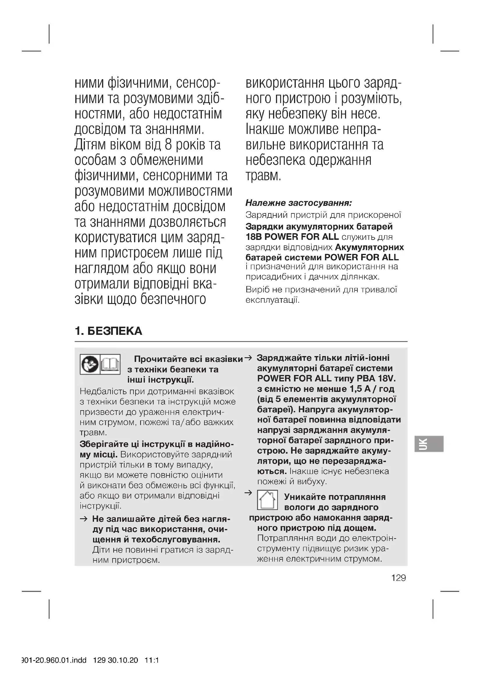 Це переклад оригіналу інструкції. Цей зарядний при- стрій не передба- чений для використання дітьми і особами з обмеже- 14901-20.960.01.indd 128 30.10.20 11:12ними фізичними, сенсор- ними та розумовими здіб- ностями, або недостатнім досвідом та знаннями. Дітям віком від 8 років та особам з обмеженими фізичними, сенсорними та розумовими можливостями або недостатнім досвідом та знаннями дозволяється користуватися цим заряд- ним пристроєем лише під наглядом або якщо вони отримали відповідні вка- зівки щодо безпечного використання цього заряд- ного пристрою і розуміють, яку небезпеку він несе. Інакше можливе непра- вильне використання та небезпека одержання
