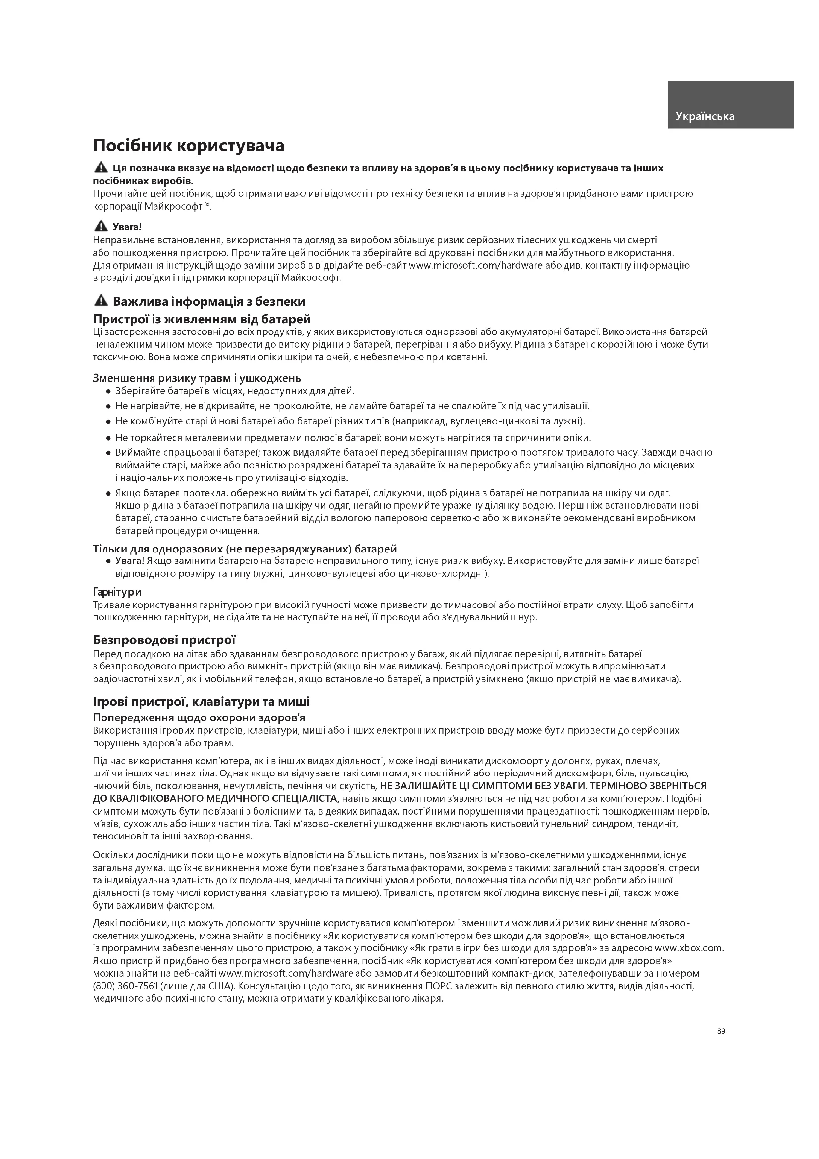 Неправильне встановлення, використання та догляд за виробом збiльшує ризик серйозних тiлесних ушкоджень чи смертi або пошкодження пристрою. Прочитайте цей посiбник та зберiгайте всi друкованi посiбники для майбутнього використання. Для отримання iнструкцiй щодо замiни виробiв вiдвiдайте веб-сайт www.microsoft.com/hardware або див. контактну iнформацiю в роздiлi довiдки i пiдтримки корпорацiї Майкрософт. Важлива iнформацiя з безпеки Пристрої iз живленням вiд батарей Цi застереження застосовнi до всiх продуктiв, у яких використовуються одноразовi або акумуляторнi батареї. Використання батарей неналежним чином може призвести до витоку рiдини з батарей, перегрiвання або вибуху. Рiдина з батареї є корозiйною i може бути токсичною. Вона може спричиняти опiки шкiри та очей, є небезпечною при ковтаннi. Зменшення ризику травм i ушкоджень ●Зберiгайте батареї в мiсцях, недоступних для дiтей. ●Не нагрiвайте, не вiдкривайте, не проколюйте, не ламайте батареї та не спалюйте їх пiд час утилiзацiї. ●Не комбiнуйте старi й новi батареї або батареї рiзних типiв (наприклад, вуглецево-цинковi та лужнi). ●Не торкайтеся металевими предметами полюсiв батареї; вони можуть нагрiтися та спричинити опiки. ● Виймайте спрацьованi батареї; також видаляйте батареї перед зберiганням пристрою протягом тривалого часу. Завжди вчасно виймайте старi, майже або повнiстю розрядженi батареї та здавайте їх на переробку або утилiзацiю вiдповiдно до мiсцевих i нацiональних положень про утилiзацiю вiдходiв. ●Якщо батарея протекла, обережно виймiть усi батареї, слiдкуючи, щоб рiдина з батареї не потрапила на шкiру чи одяг. Якщо рiдина з батареї потрапила на шкiру чи одяг, негайно промийте уражену дiлянку водою. Перш нiж встановлювати новi батареї, старанно очистьте батарейний вiддiл вологою паперовою серветкою або ж виконайте рекомендованi виробником батарей процедури очищення. Тiльки для одноразових (не перезаряджуваних) батарей ● Увага! Якщо замiнити батарею на батарею неправильного типу, iснує ризик вибуху. Використовуйте для замiни лише батареї вiдповiдного розмiру та типу (лужнi, цинково-вуглецевi або цинково-хлориднi). Гарнiтури Тривале користування гарнiтурою при високiй гучностi може призвести до тимчасової або постiйної втрати слуху. Щоб запобiгти пошкодженню гарнiтури, не сiдайте та не наступайте на неї, її проводи або з’єднувальний шнур. Безпроводовi пристрої Перед посадкою на лiтак або здаванням безпроводового пристрою у багаж, який пiдлягає перевiрцi, витягнiть батареї з безпроводового пристрою або вимкнiть пристрiй (якщо вiн має вимикач). Безпроводовi пристрої можуть випромiнювати радiочастотнi хвилi, як i мобiльний телефон, якщо встановлено батареї, а пристрiй увiмкнено (якщо пристрiй не має вимикача). Iгровi пристрої, клавiатури та мишi Попередження щодо охорони здоров’я Використання iгрових пристроїв, клавiатури, мишi або iнших електронних пристроїв вводу може бути призвести до серйозних порушень здоров’я або травм. Пiд час використання комп’ютера, як i в iнших видах дiяльностi, може iнодi виникати дискомфорт у долонях, руках, плечах, шиї чи iнших частинах тiла. Однак якщо ви вiдчуваєте такi симптоми, як постiйний або перiодичний дискомфорт, бiль, пульсацiю, ниючий бiль, поколювання, нечутливiсть, печiння чи скутiсть, НЕ ЗАЛИШАЙТЕ ЦI СИМПТОМИ БЕЗ УВАГИ. ТЕРМIНОВО ЗВЕРНIТЬСЯ ДО КВАЛIФIКОВАНОГО МЕДИЧНОГО СПЕЦIАЛIСТА, н