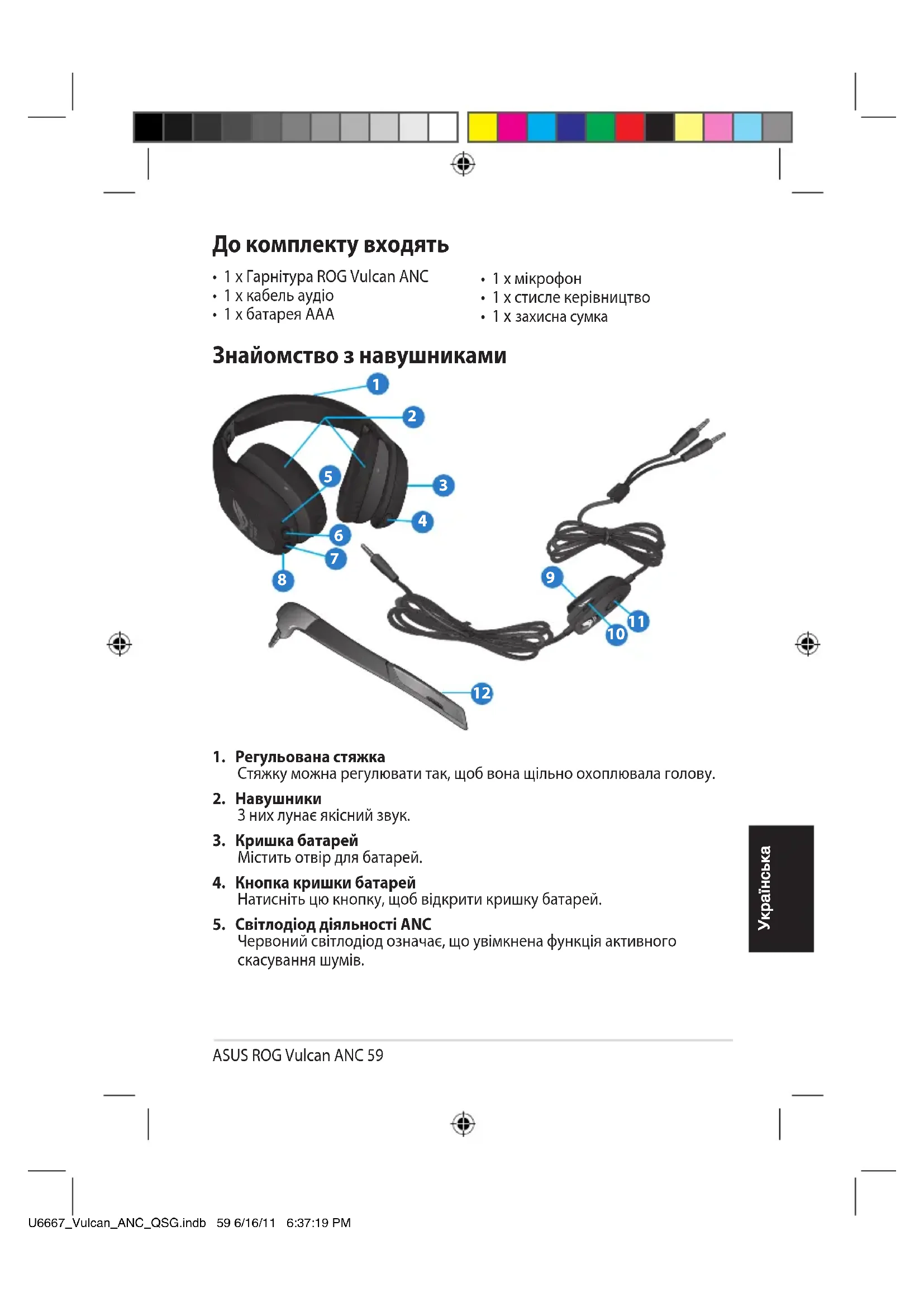 Знайомство з навушниками U6667_Vulcan_ANC_QSG.indb 59 6/16/11 6:37:19 PM60 Коротка інструкція