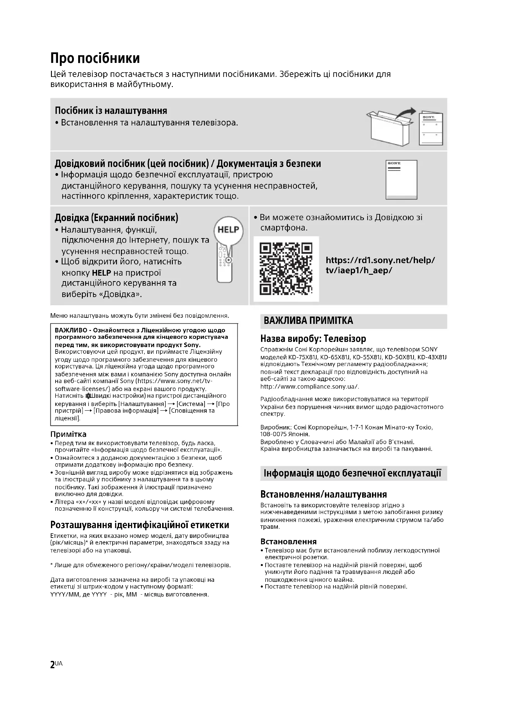 https://rd1.sony.net/help/ tv/iaep1/h_aep/ ВАЖЛИВО - Ознайомтеся з Ліцензійною угодою щодо програмного забезпечення для кінцевого користувача перед тим, як використовувати продукт Sony. Використовуючи цей продукт, ви приймаєте Ліцензійну угоду щодо програмного забезпечення для кінцевого користувача. Ця ліцензійна угода щодо програмного забезпечення між вами і компанією Sony доступна онлайн на веб-сайті компанії Sony (https://www.sony.net/tv- software-licenses/) або на екрані вашого продукту. Натисніть (Швидкі настройки) на пристрої дистанційного керування і виберіть [Налаштування] [Система] [Про пристрій] [Правова інформація] [Сповіщення та