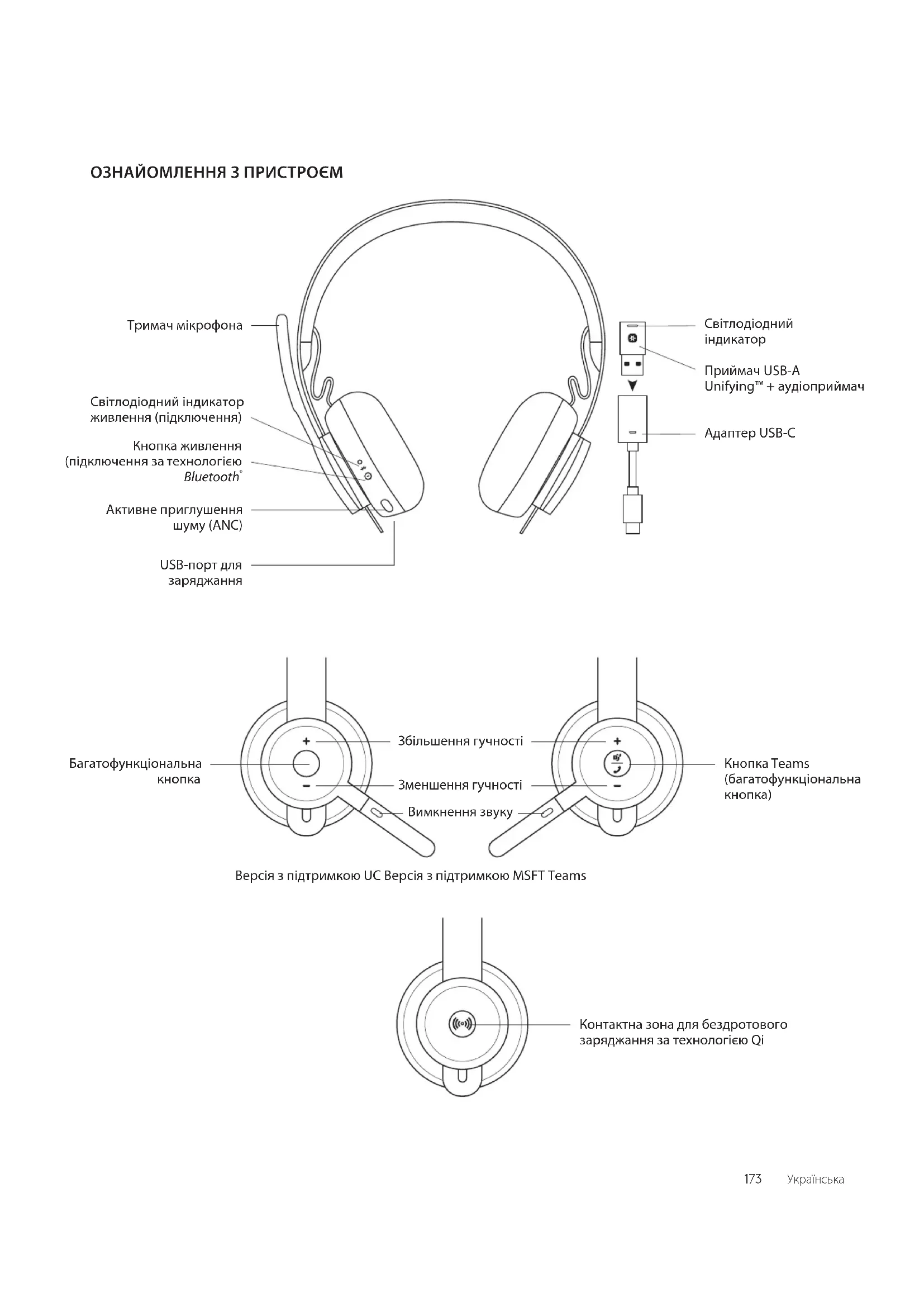 Контактна зона для бездротового заряджання за технологієюQi Версія зпідтримкою UC Версія зпідтримкою MSFT Teams 173 УкраїнськаUSB-A USB-C ADAPTER USB-A | USB-C Zone Wireless