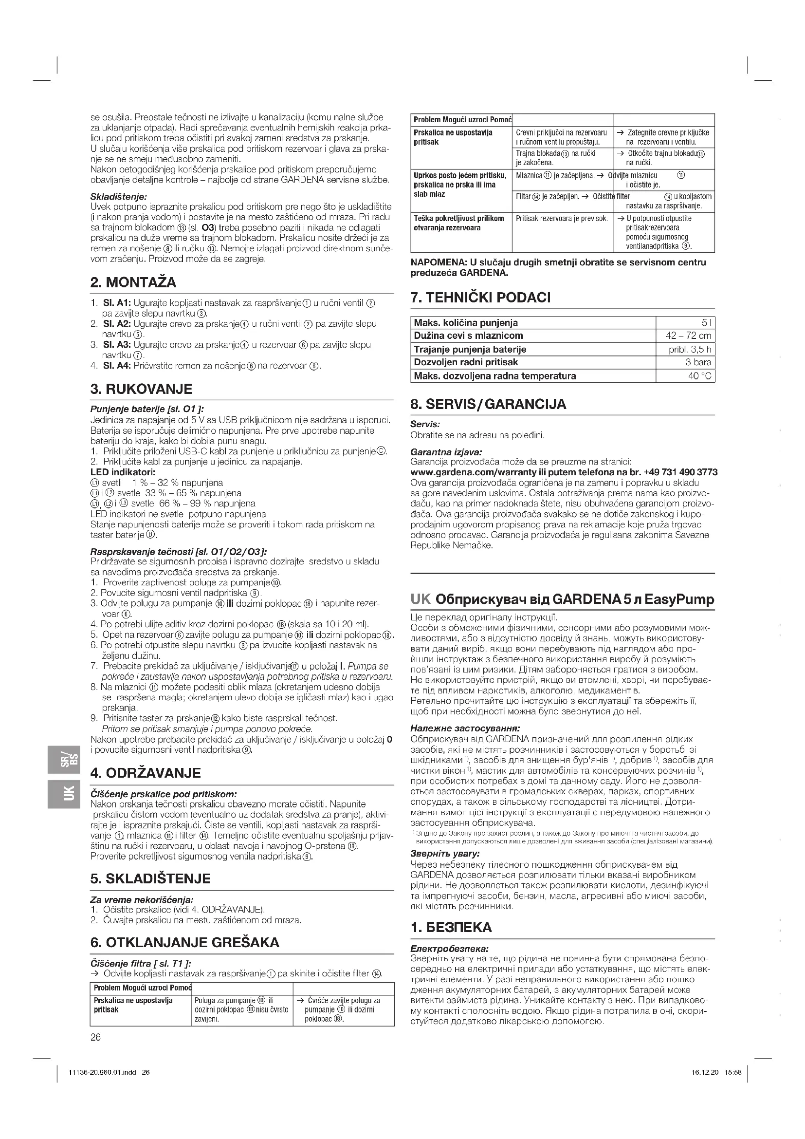 Servis: Obratite se na adresu na poleđini. Garantna izjava: Garancija proizvođača može da se preuzme na stranici: www.gardena.com/warranty ili putem telefona na br. +49 731 490 3773 Ova garancija proizvođača ograničena je na zamenu i popravku u skladu sa gore navedenim uslovima. Ostala potraživanja prema nama kao proizvo- đaču, kao na primer nadoknada štete, nisu obuhvaćena garancijom proizvo- đača. Ova garancija proizvođača svakako se ne dotiče zakonskog ikupo- prodajnim ugovorom propisanog prava na reklamacije koje pruža trgovac odnosno prodavac. Garancija proizvođača je regulisana zakonima Savezne Republike Nemačke. UK Обприскувач від GARDENA 5 л EasyPump Це переклад оригіналу інструкції. Особи з обмеженими фізичними, сенсорними або розумовими мож- ливостями, або з відсутністю досвіду й знань, можуть використову- вати даний виріб, якщо вони перебувають під наглядом або про- йшли інструктаж з безпечного використання виробу й розуміють пов’язані із цим ризики. Дітям забороняється гратися з виробом. Не використовуйте пристрій, якщо ви втомлені, хворі, чи перебуває- те під впливом наркотиків, алкоголю, медикаментів. Ретельно прочитайте цю інструкцію з експлуатації та збережіть її, щоб при необхідності можна було звернутися до неї. Належне застосування: Обприскувач від GARDENA призначений для розпилення рідких засобів, які не містять розчинників і застосову ються у боротьбі зі