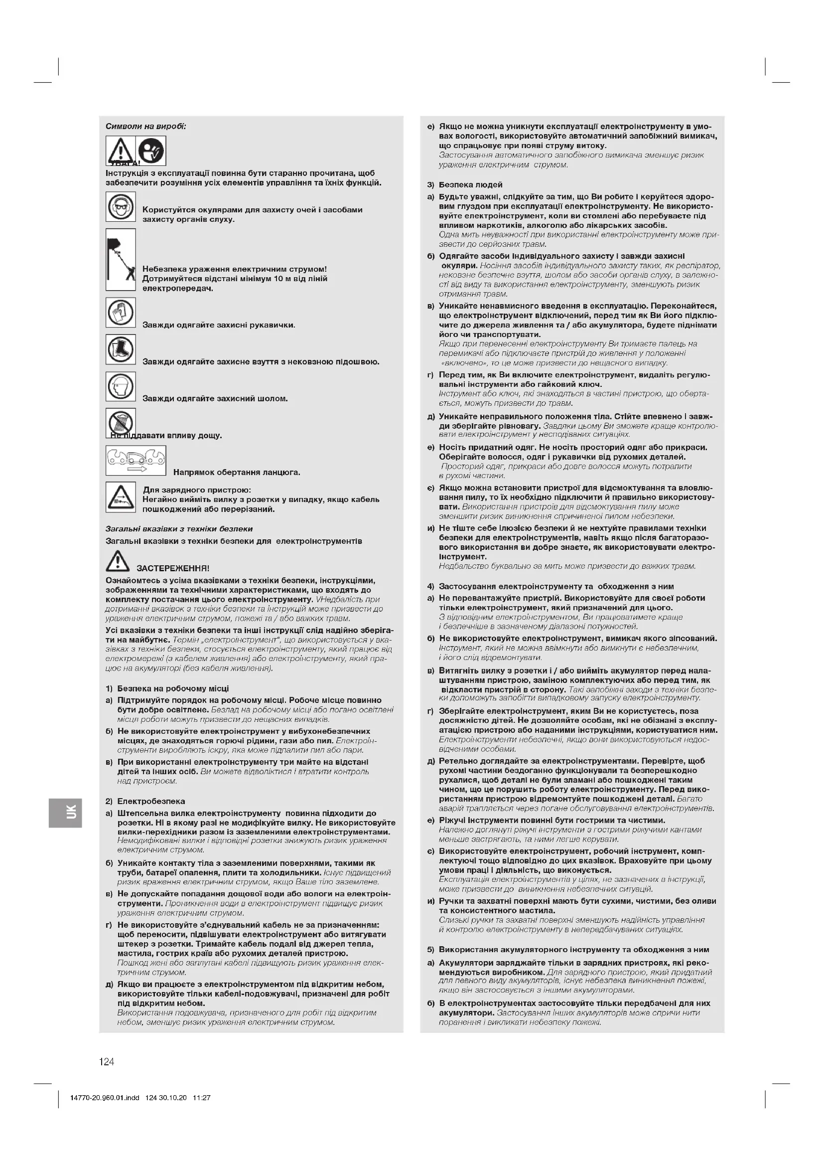 Напрямок обертання ланцюга. Для зарядного пристрою: Негайно вийміть вилку з розетки у випадку, якщо кабель пошкоджений або перерізаний. Загальні вказівки з техніки безпеки Загальні вказівки з техніки безпеки для електроінструментів ЗАСТЕРЕЖЕННЯ! Ознайомтесь з усіма вказівками з техніки безпеки, інструкціями, зображеннями та технічними характеристиками, що входять до комплекту постачання цього електроінструменту. VНедбалість при дотриманні вказівок з техніки безпеки та інструкцій може призвести до ураження електричним струмом, пожежі та / або важких травм. Усі вказівки з техніки безпеки та інші інструкції слід надійно зберіга- ти на майбутнє. Термін „електроінструмент“, що використовується у вка- зівках з техніки безпеки, стосується електроінструменту, який працює від електромережі (з кабелем живлення) або електроінструменту, який пра- цює на акумуляторі (без кабеля живлення).