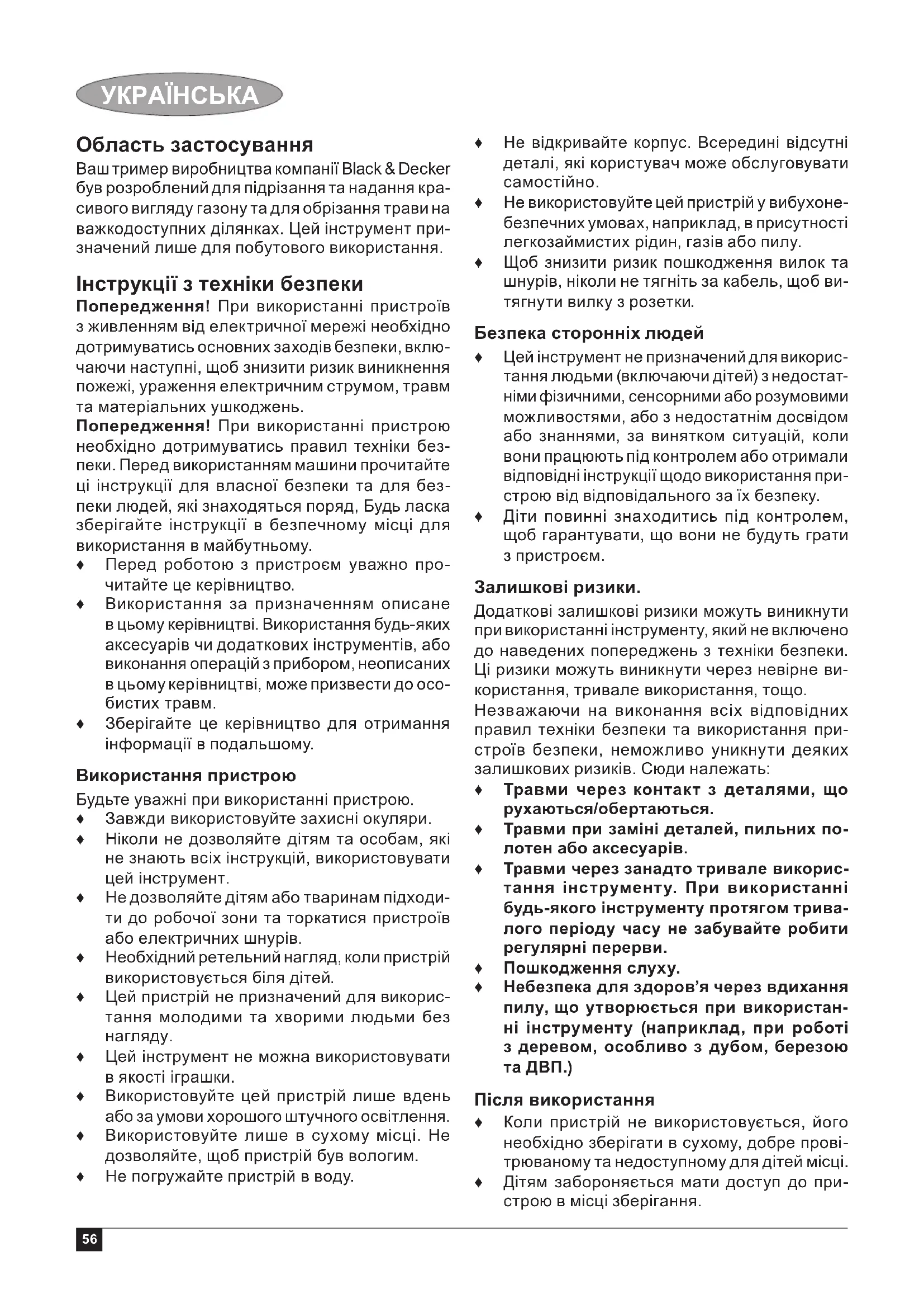 Область застосування Ваш тример виробництва компанії Black & Decker був розроблений для підрізання та надання кра- сивого вигляду газону та для обрізання трави на важкодоступних ділянках. Цей інструмент при- значений лише для побутового використання. Інструкції з техніки безпеки Попередження! При використанні пристроїв з живленням від електричної мережі необхідно дотримуватись основних заходів безпеки, вклю- чаючи наступні, щоб знизити ризик виникнення пожежі, ураження електричним струмом, травм та матеріальних ушкоджень. Попередження! При використанні пристрою необхідно дотримуватись правил техніки без- пеки. Перед використанням машини прочитайте ці інструкції для власної безпеки та для без