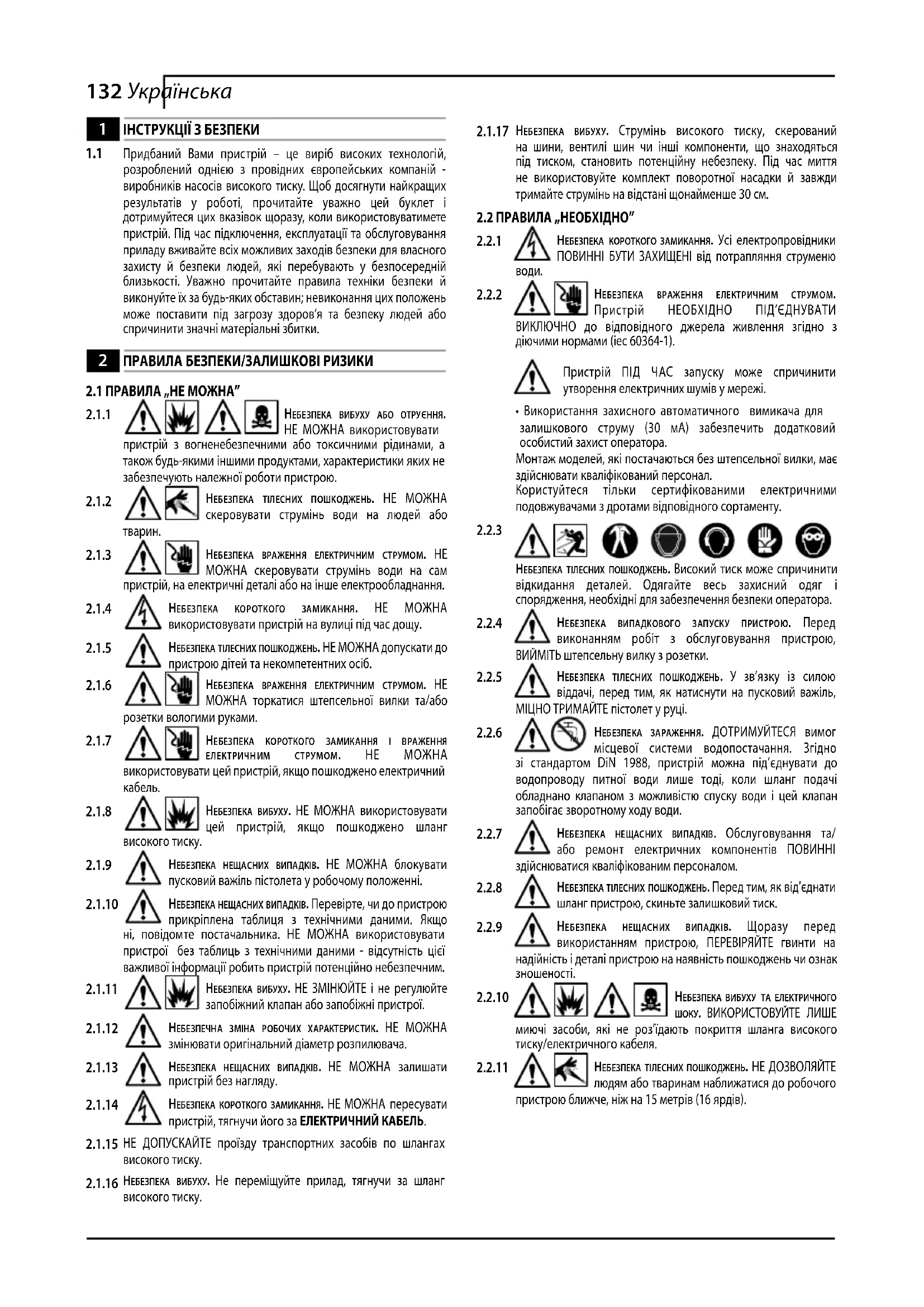 розроблений однією з провідних європейських компаній - виробників насосів високого тиску. Щоб досягнути найкращих результатів у роботі, прочитайте уважно цей буклет і дотримуйтеся цих вказівок щоразу, коли використовуватимете пристрій. Під час підключення, експлуатації та обслуговування приладу вживайте всіх можливих заходів безпеки для власного захисту й безпеки людей, які перебувають у безпосередній близькості. Уважно прочитайте правила техніки безпеки й виконуйте їх за будь-яких обставин; невиконання цих положень може поставити під загрозу здоров’я та безпеку людей або спричинити значні матеріальні збитки.