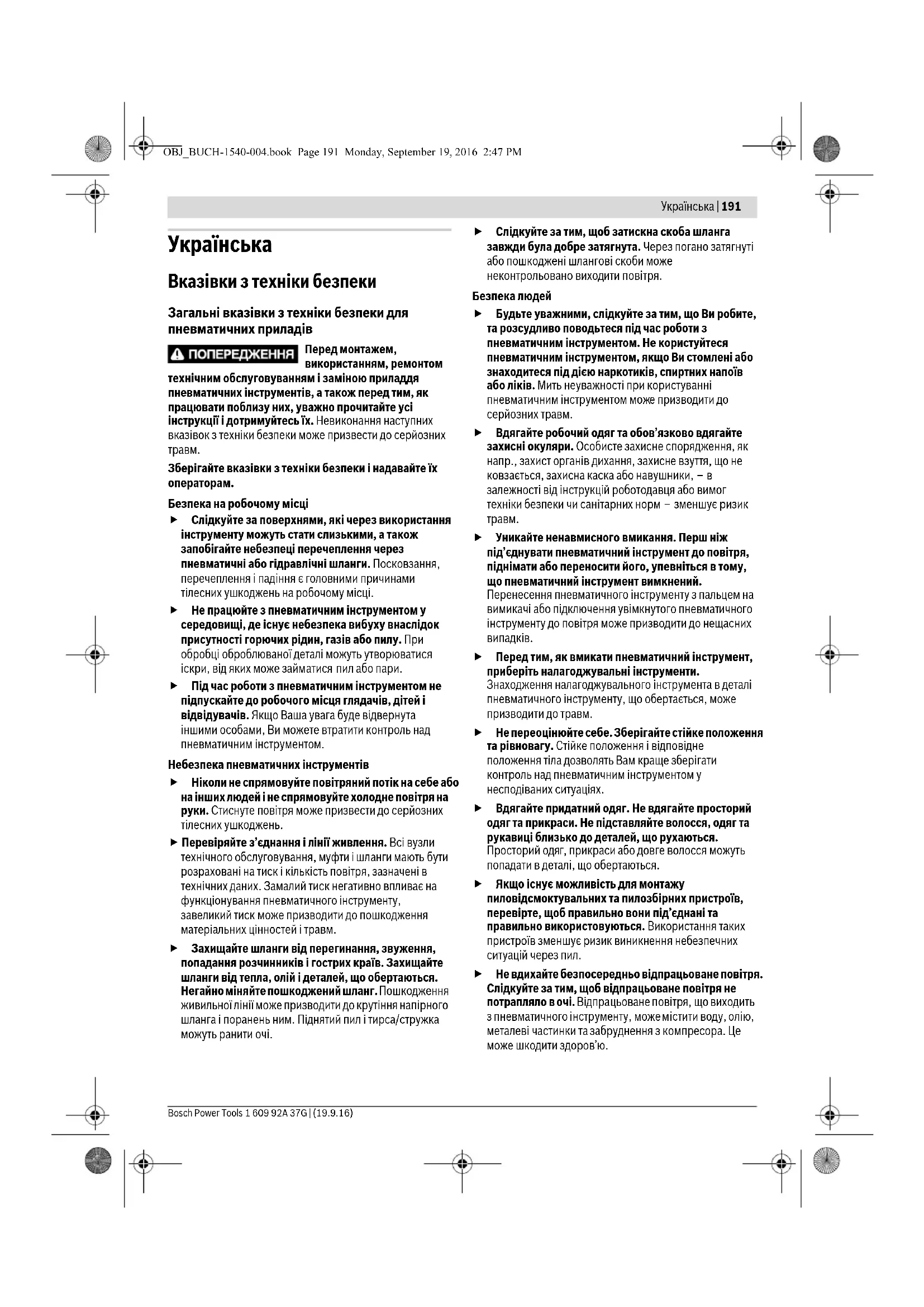блюваного матеріалу. Для погашення реакційних моментів використовуйте допоміжний пристрій, наприклад, опору. Якщо це неможливо, використовуйте додаткову рукоятку. Ніколи не тримайте руку поблизу від робочого інструмента, що обертається. Ви можете поранитися. При перебоях з постачанням повітря і при зменшенні робочого тиску вимкніть пневматичний інструмент. Перевірте робочий тиск і знову увімкніть інструмент, коли робочий тиск знову буде оптимальним. Під час роботи з пневматичним інструментом в оператора можуть виникнути неприємні відчуття в кистях, руках, плечах, шиї або в інших частинах тіла. OBJ_BUCH-1540-004.book Page 192 Monday, September 19, 2016 2:47 PMУкраїнська | 193 Bosch Power Tools 1 609 92A 37G | (19.9.16) Для роботи з цим пневматичним інструментом станьте у зручну позу, не забувайте надійно тримати інструмент і уникайте незручних положень або положень, в яких важко зберігати рівновагу. Під час тривалої роботи оператор повинен змінювати положення тіла для запобігання незручності та