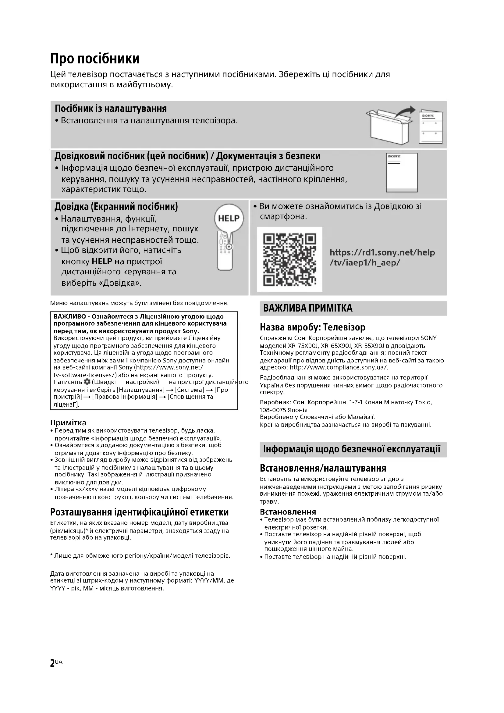 https://rd1.sony.net/help /tv/iaep1/h_aep/ ВАЖЛИВО - Ознайомтеся з Ліцензійною угодою щодо програмного забезпечення для кінцевого користувача перед тим, як використовувати продукт Sony. Використовуючи цей продукт, ви приймаєте Ліцензійну угоду щодо програмного забезпечення для кінцевого користувача. Ця ліцензійна угода щодо програмного забезпечення між вами і компанією Sony доступна онлайн на веб-сайті компанії Sony (https://www.sony.net/tv-software-licenses/) або на екрані вашого продукту. Натисніть (Швидкі настройки) на пристрої дистанційного керування і виберіть [Налаштування] t [Система] t [Про пристрій] t [Правова інформація] t [Сповіщення та ліцензії].C:\Users\User\Desktop\AR\SY21_AR_EU_RG_111\5025304111\21UA\UA\5025304111_21UA.fm master page: Right XR-75X9xJ / 65X9xJ / 55X9xJ / 50X9xJ 5-025-304-11(1)