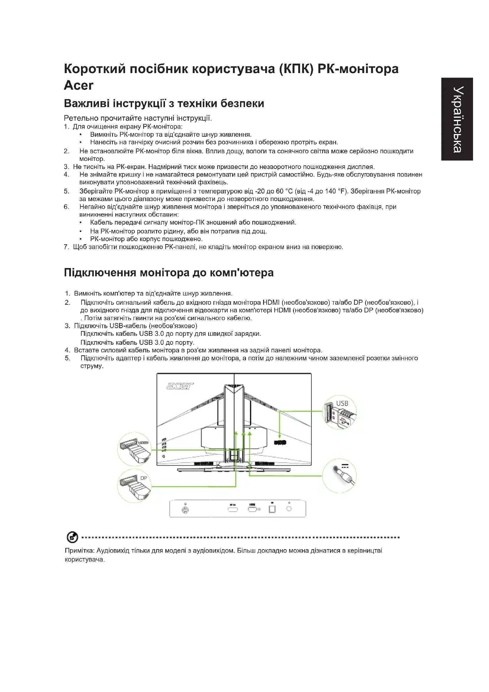 Короткий посібник користувача (КПК) РК-монітора Acer Важливі інструкції з техніки безпеки Ретельнопрочитайтенаступніінструкції.