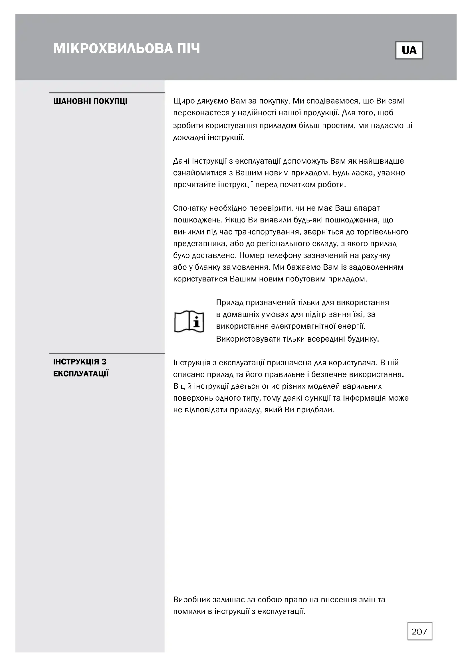 Щиро дякуємо Вам за покупку. Ми сподіваємося, що Ви самі переконаєтеся у надійності нашої продукції. Для того, щоб зробити користування приладом більш простим, ми надаємо ці докладні інструкції. Дані інструкції з експлуатації допоможуть Вам як найшвидше ознайомитися з Вашим новим приладом. Будь ласка, уважно прочитайте інструкції перед початком роботи. Спочатку необхідно перевірити, чи не має Ваш апарат пошкоджень. Якщо Ви виявили будь-які пошкодження, що виникли під час транспортування, зверніться до торгівельного представника, або до регіонального складу, з якого прилад було доставлено. Номер телефону зазначений на рахунку або у бланку замовлення. Ми бажаємо Вам із задоволенням користуватися Вашим новим побутовим приладом. Прилад призначений тільки для використання в домашніх умовах для підігрівання їжі, за використання електромагнітної енергії. Використовувати тільки всередині будинку. Інструкція з експлуатації призначена для користувача. В ній описано прилад та його правильне і безпечне використання. В цій інструкції дається опис різних моделей варильних поверхонь одного типу, тому деякі функції та інформація може не відповідати приладу, який Ви придбали. Виробник залишає за собою право на внесення змін та помилки в інструкції з експлуатації. ШАНОВНІ ПОКУПЦІ ІНСТРУКЦІЯ З ЕКСПЛУАТАЦІЇ