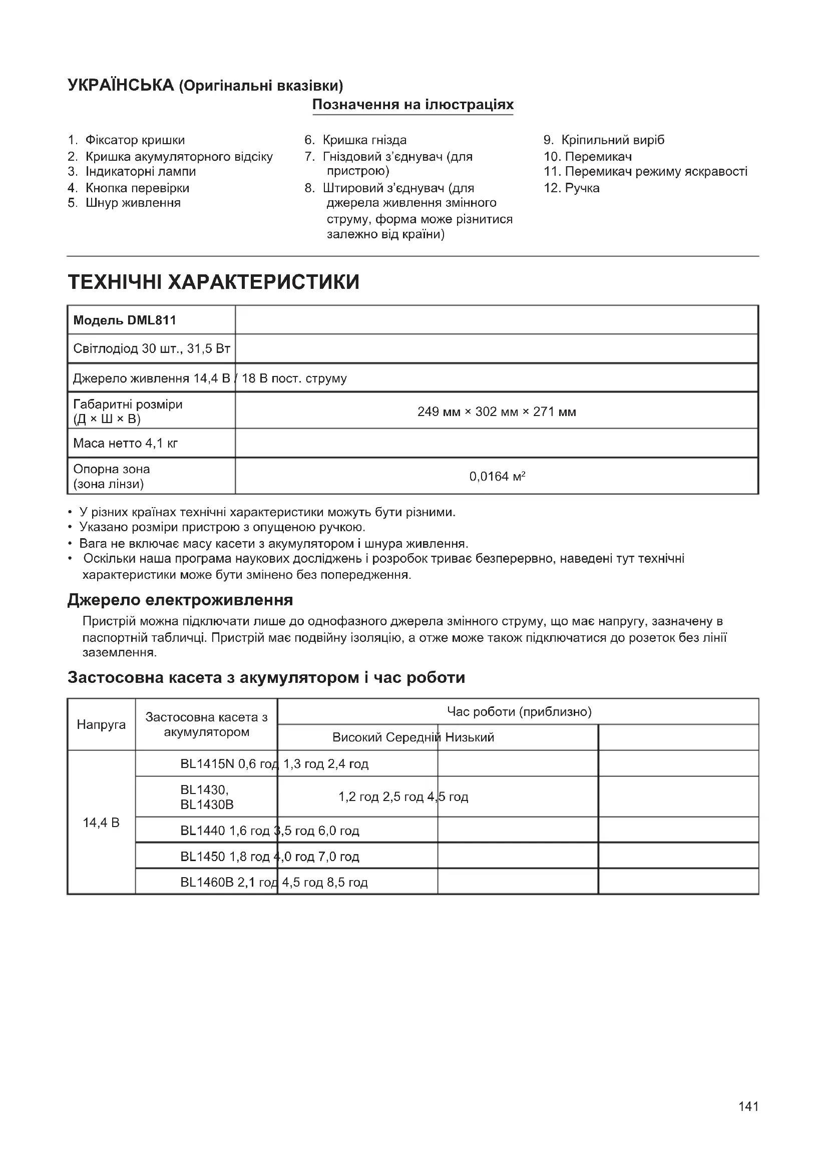 - Оскільки наша програма наукових досліджень і розробок триває безперервно, наведені тут технічні характеристики може бути змінено без попередження. Джерело електроживлення Пристрій можна підключати лише до однофазного джерела змінного струму, що має напругу, зазначену в паспортній табличці. Пристрій має подвійну ізоляцію, а отже може також підключатися до розеток без лінії заземлення. Застосовна касета з акумулятором і час роботи